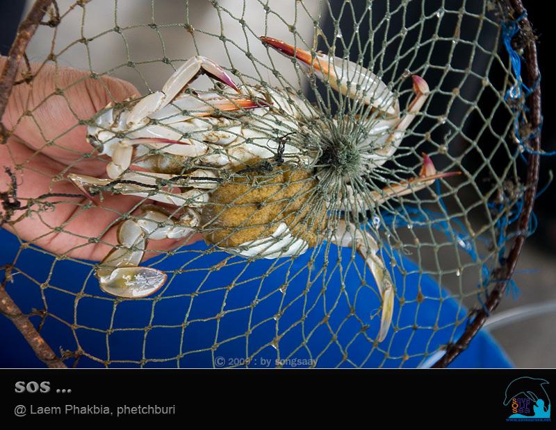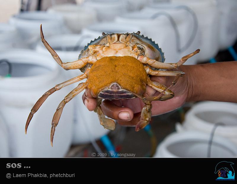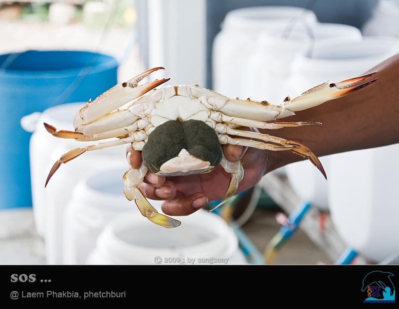 ผอ.ธเนศ ช้อนแม่ปูขึ้นมาให้ดู 1 ตัว .... พลิกกลับขึ้นมาจะเห็นไข่มากมายจนล้นจับปิ้งออกมา