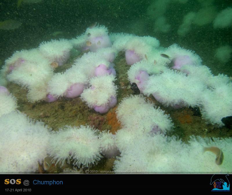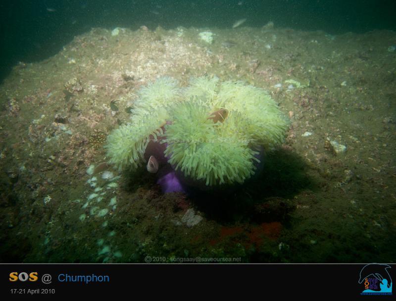ขอแปะมือมาโพสต์ช่วงปิดทริปแทนคุณสายชลครับ .... จาก SOS Pinnacle I ... เราตั้งใจจะไปดำไดฟ์สุดท้ายที่เกาะหลักง่าม แต่ธรรมชาติไม่เป็นใจ ลมเกิดแรงขึ้นมาเสียเฉยๆ จนกัปตันชัยต้องเปลี่ยนแผนนำเรือเข้าไปหลบคลื่นและลมที่เกาะง่ามใหญ่ และในเมื่อไปไหนไม่ไหวแล้ว เราจึงต้องดำปิดทริปกันที่เกาะง่ามใหญ่ ด้านตะวันออก เกาะง่ามใหญ่ เดิมจะมีปะการังหนังปกคลุมก้อนหินเต็มไปหมด แต่หลังจากที่พายุเกย์พัดเข้าถล่มชุมพร เกาะง่ามใหญ่ถูกแรงคลื่นและกระแสน้ำโหมเข้ากระแทกอย่างรุนแรง จนปะการังหนังหลุดลอยหายไปเกือบหมด เหลือแต่กองหินเปล่าๆไว้ให้ดูเท่านั้น เป็นเวลานานมากที่สองสายไม่ได้มาดำที่ด้านนี้ของเกาะง่ามใหญ่ จึงเป็นโอกาสดีที่จะลงไปสำรวจดูเสียหน่อยว่า ปะการังหนังหนาแน่นขึ้นหรือไม่ แต่ ... ยังไม่ทันเห็นปะการังหนัง ก็ต้องพบภาพสะเทือนใจเสียแล้ว บรรดาดอกไม้ทะเล (Sea Anemones) บนกองหินเริ่มเปลี่ยนสี บางตัวกลายเป็นสีขาวไปเรียบร้อยแล้วด้วย