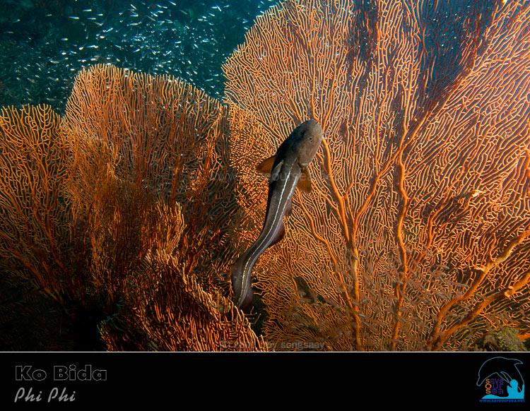 ที่พื้นทรายโคนกัลปังหา....มีปลาดุกทะเลตัวโตนอนหมอบนิ่งอยู่ เมื่อเข้าไปดูใกล้ๆ เจ้าปลาดุกทะเลตัวนั้น ก็โผนทะยานว่ายขึ้นมาบนกอกัลปังหา...
