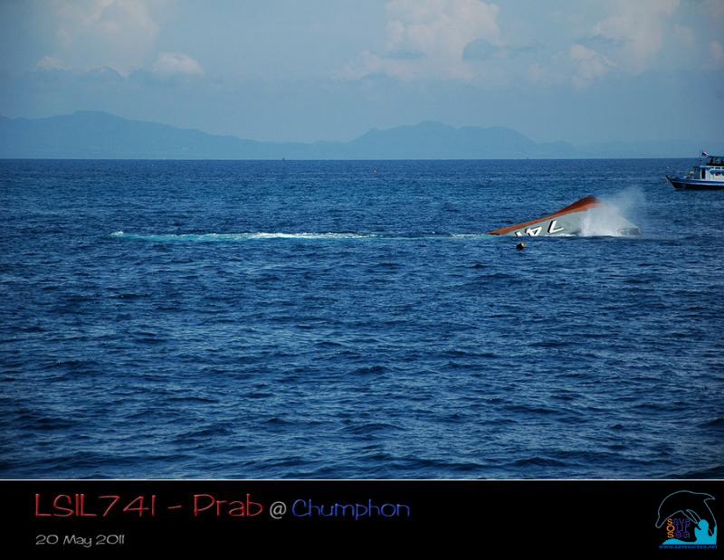 แต่ดูเหมือนจะไม่ใช่วิธีที่ถูกต้อง และสายเกินไป เรือปราบยังคงเอียงไปทางกราบขวา .... เอียงลงๆๆๆ 9.55 น. ส่วนท้ายด้านกราบขวาเริ่มจมลงสู่ใต้ผิวน้ำ จนในที่สุด ก็พลิกคว่ำ และส่วนหัวพ้นผิวน้ำ และจมลงจนมิดลำเมื่อเวลา 9.59 น. ช่วงเวลาการวางเรือปราบลงสู่ใต้ท้องทะเล....มีเรือรบลำใหญ่ที่บรรทุกผู้มีเกียรติไปสังเกตการณ์ และบนท้องฟ้า มีเฮลิคอปเตอร์ของกระทรวงทรัพยากรธรรมชาติและสิ่งแวดล้อม บรรทุกนักข่าวและตากล้อง บินวนเวียนหึ่งๆ บางครั้งก็โฉบเฉี่ยวมาใกล้เรือที่เราอยู่ จนใบพัดตีน้ำกระจาย เราต้องรีบนำกล้องหลบน้ำทะเลกันแทบไม่ทัน....