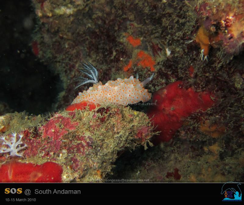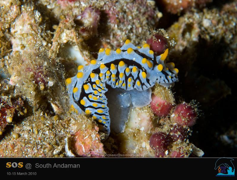 เราวกกลับมาตรวจเช็คม้าน้ำที่ปล่อยอีกครั้งในวันที่ 3 ของทริป สรุปว่า หาม้าน้ำไม่เจอสักตัวเดียว พวกเขาคงจะเที่ยวเร่ร่อนไปหาที่อยู่ใหม่ที่คิดว่าเหมาะสมกันหมด ส่วนสัตว์อื่นๆที่พบก็มี เจ้าทากปุ่มสามัญพันธุ์ที่เห็นได้ทั่วไป Phyllidia varicosa อย่างตัวนี้ ที่กำลังเขมือบเพรียงหัวหอมหรือฟองน้ำเป็นอาหารเช้าอย่างขมักเขม้น