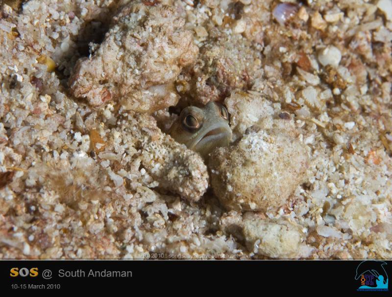 ขืนปล่อยตัวไปตามกระแสน้ำเรื่อยๆ คงไม่ไหว เพราะฟาดเข้าไป 60 -70 ฟุตแล้ว จึงต้องพยายามตะกายทรายเลาะเข้ามาแนวเกาะให้ได้ ตามรูบนพื้นทราย นอกจากพวกปลาบู่ Goby แล้ว ยังมีพวกปลาอมไข่ หรือ Jawfish อยู่หลายตัวทีเดียว แต่บังเอิญตัวที่ถ่ายได้นี่ ตัวกระจิ๋วเดียว และไม่ได้อมไข่ด้วย