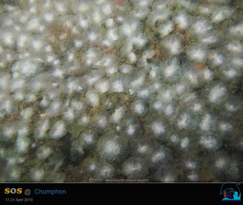 ขอแปะมือมาโพสต์ช่วงปิดทริปแทนคุณสายชลครับ .... จาก SOS Pinnacle I ... เราตั้งใจจะไปดำไดฟ์สุดท้ายที่เกาะหลักง่าม แต่ธรรมชาติไม่เป็นใจ ลมเกิดแรงขึ้นมาเสียเฉยๆ จนกัปตันชัยต้องเปลี่ยนแผนนำเรือเข้าไปหลบคลื่นและลมที่เกาะง่ามใหญ่ และในเมื่อไปไหนไม่ไหวแล้ว เราจึงต้องดำปิดทริปกันที่เกาะง่ามใหญ่ ด้านตะวันออก เกาะง่ามใหญ่ เดิมจะมีปะการังหนังปกคลุมก้อนหินเต็มไปหมด แต่หลังจากที่พายุเกย์พัดเข้าถล่มชุมพร เกาะง่ามใหญ่ถูกแรงคลื่นและกระแสน้ำโหมเข้ากระแทกอย่างรุนแรง จนปะการังหนังหลุดลอยหายไปเกือบหมด เหลือแต่กองหินเปล่าๆไว้ให้ดูเท่านั้น เป็นเวลานานมากที่สองสายไม่ได้มาดำที่ด้านนี้ของเกาะง่ามใหญ่ จึงเป็นโอกาสดีที่จะลงไปสำรวจดูเสียหน่อยว่า ปะการังหนังหนาแน่นขึ้นหรือไม่ แต่ ... ยังไม่ทันเห็นปะการังหนัง ก็ต้องพบภาพสะเทือนใจเสียแล้ว บรรดาดอกไม้ทะเล (Sea Anemones) บนกองหินเริ่มเปลี่ยนสี บางตัวกลายเป็นสีขาวไปเรียบร้อยแล้วด้วย