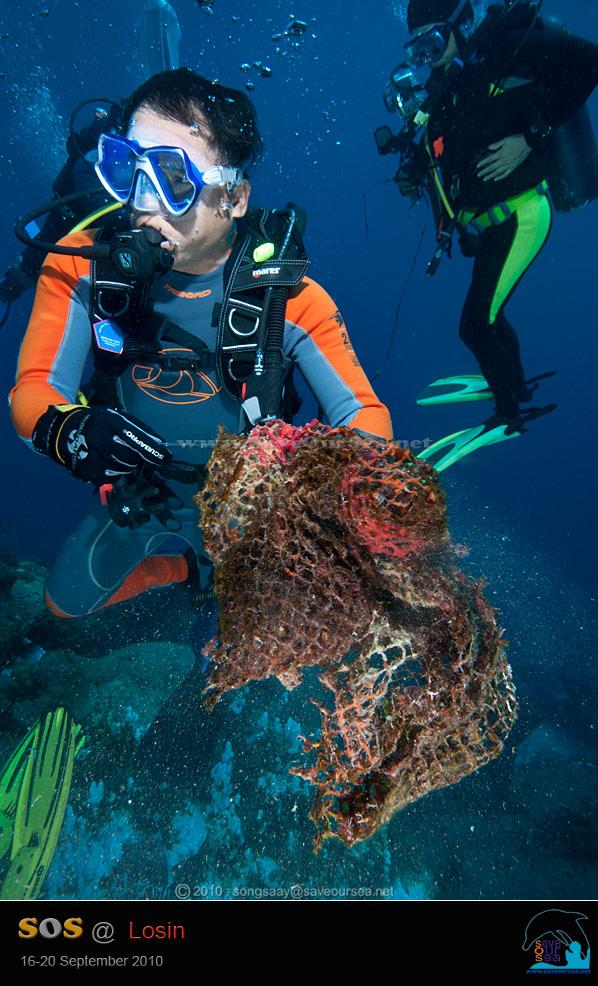 เพื่อนพ้องน้องพี่ที่ไปด้วยกันเมื่อปีที่แล้ว คงจำเศษอวนยักษ์ผืนนี้ได้ จากน้ำหนักของอวน บวกกับตุ้มเหล็กที่ถ่วงอวนทำให้ทั้งพวกเราและคนเรือไม่สามารถนำเศษอวนขึ้นเรือได้ มันจึงหล่นกลับลงมาอยู่ใต้น้ำอีก