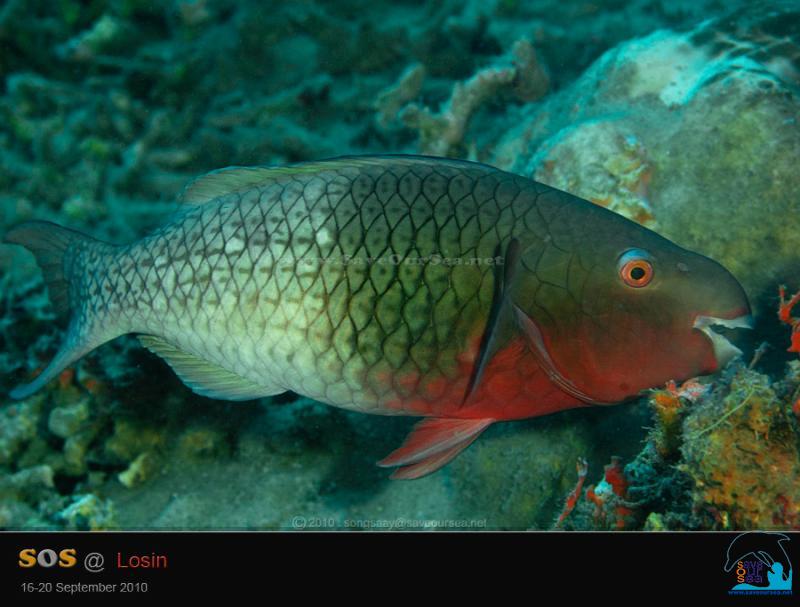 ในหนังสือ เรียกว่า ปลานกแก้วสีเพลิง (Bluebarred Parrotfish) ..... ดูแล้วก็ไม่เห็นจะเป็นสีเพลิงตรงไหนเลยครับ