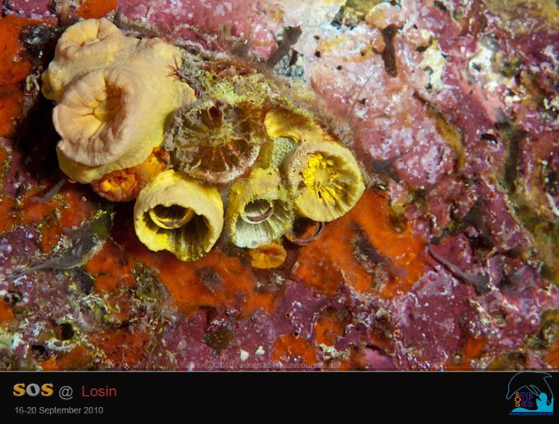 ปะการังถ้วยส้มตามโขดหินใหญ่ๆจะสวยงามมากเมื่อยื่นโพลิพส์ออกมากินแพลงค์ตอน แต่เมื่อยามที่ยังไม่ถึงเวลากินอาหาร ถ้าไม่สังเกต เราแทบจะไม่รู้เลยว่าปะการังถ้วยส้มนั้น ยังมีชีวิตอยู่ดีหรือไม่ ตัวทำลายปะการังชนิดนี้คือ หอยเกลียวชั้นปะการังถ้วยส้ม (Wentaltrap) ที่จะยื่นงวงเข้าไปในปะการัง แล้วใช้เคมีละลายเนื้อเยื่อโพลิพส์ของปะการังและดูดไปกิน หลังจากนั้นก็อึรด เอ๊ย ไม่ใช่ .... วางไข่ทับบนซากชองปะการังที่ไร้ชีวิตแล้ว สังเกตได้ง่ายๆคือ ถ้าปะการังยังมีอะไรหุ้มๆอยู่ นั่นหมายถึงยังมีชีวิตดี แต่ถ้าเหลือแต่หินปูนแข็งๆ ข้างในกลวงโบ๋ นั่นคือ เรียบร้อยโรงเรียนหอยไปแล้วครับ