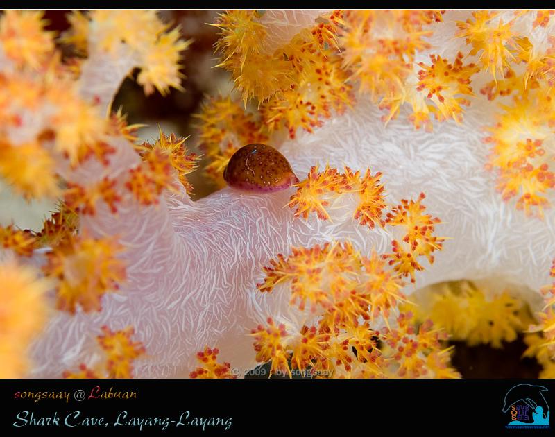 จากที่เคยดำน้ำแบบว่ายขนานไปกับผิวน้ำ ก้มหน้ามองหาฉลามข้างล่าง เราเริ่มตั้งตัวตรง ตัวตั้งฉากกับผิวน้ำ และหันหน้าเข้าหาหน้าผา ของดีมีให้ดูตามซอกหลืบของหน้าผา..... ไม่น่าเชื่อ.....ที่เราได้เห็น หอยเบี้ย (Cowry) จริงๆ ไม่ใช่หอยเบี้ยเทียม (Allied Cowry) เขาเป็นหอยเบี้ยตัวสีน้ำตาลอ่อน มีจุดสีน้ำตาลเข้มแต้มขาว และขึ้นไปเกาะอยู่บนกิ่งปะการังสีแดงส้มสดใส