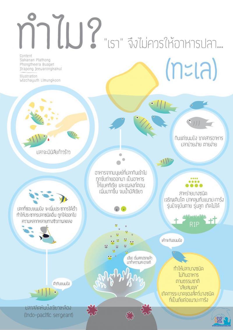 การให้อาหารปลาในแนวปะการัง อย่าคิดว่าไม่มีผลกระทบ!! ![]() เมื่อวันหยุดยาวมาถึง จุดมุ่งหมายของคนเมืองหรือมนุษย์เงินเดือนอย่างเราๆ น่าจะเป็นการนอนชิลริมทะเลหรือดำน้ำเพื่อคลายร้อนและชื่นชมแนวปะการังและฝูงปลาที่ทะเลสวยๆสักแห่งหนึ่ง กระแสข่าวที่มีการถกเถียงกันเรื่องการให้อาหารปลาในแนวปะการังเพื่อหลอกล่อให้เจ้าฝูงปลาสีสวยในแนวปะการังมารวมฝูงเพื่อถ่ายรูปด้วยความภาคภูมิใจถึงความสวยงามของทะเลไทย แต่เขาเหล่านั้นกลับทำร้ายทะเลและระบบนิเวศโดยไม่รู้ตัว เรามาดูกันว่าพฤติกรรมเช่นนี้ทำร้ายหรือสร้างผลกระทบอะไรบ้าง 1. สัญชาติญาณในการระวังภัยตามธรรมชาติหายไป ทำให้เสี่ยงต่อการถูกทำร้ายจากสิ่งมีชีวิตชนิดอื่นๆ เช่นการว่ายน้ำเข้าหาเรืออาจจะมีความเสี่ยงถูกใบพัดเรือบาดได้ 2. พฤติกรรมสัตว์น้ำเปลี่ยนไปเมื่อมีการให้อาหาร พฤติกรรมการกินของปลาจึงเปลี่ยนไป เนื่องจากเมื่อมันกินขนมปังหรืออาหารอื่นที่นักท่องเที่ยวให้จนอิ่ม มันจึงไม่กินอาหารตามธรรมชาติ ส่งผลให้เกิดการขาดสารอาหาร สุขภาพสัตว์น้ำอ่อนแอและตายในที่สุด 3. ส่งผลกระทบต่อความหลากหลายทางชีวภาพ เมื่อมีการให้อาหารในบริเวณนั้นๆปลาจะมารวมฝูง โดยเฉพาะ เจ้าสลิดหินเมื่อมันรวมฝูงใหญ่จะมีนิสัยก้าวร้าวและมันจะมาไล่ปลาอื่น ๆ ออกจากบริเวณนั้น ในที่สุดปลาที่มีนิสัยสุภาพเรียบร้อย เช่น ปลาผีเสื้อ ปลาสินสมุทร ก็จะลดจำนวนลง และต้องย้ายถิ่นฐานไปอยู่ที่อื่น ทำให้ระบบนิเวศบริเวณนั้นเสียความสมดุล 4. แนวปะการังเสียหาย สิ่งปฏิกูลที่เกิดจากการย่อยสลายของเศษอาหารและการขับถ่ายของปลาส่งผลให้เกิดการเจริญเติบโตของสาหร่ายบางชนิดอย่างรวดเร็วและไปปกคลุมบริเวณปะการังส่งผลให้แนวปะการังเสื่อมโทรมและตายในที่สุด 5. เกิดการสะสมสารพิษในห่วงโซ่อาหาร ขนมปังที่นำมาใช้เป็นอาหารปลาโดยส่วนใหญ่จะเป็นขนมปังที่หมดอายุซึ่งอาจจะมีเชื้อราและสารอะฟลาทอกซิน (Aflatoxin) ซึ่งมีความเป็นพิษสูงปนเปื้อนอยู่ เมื่อปลากินเข้าไปก็จะไปสะสมและเข้าสู่ห่วงโซ่อาหารในที่สุด เช่นเดียวกับการให้อาหารปลารอบๆเรือ ซึ่งเป็นบริเวณที่มีคราบน้ำมันบริเวณผิวน้ำโดยเฉพาะในช่วงเวลาที่มีเรือท่องเที่ยวจอดรวมกัน คราบน้ำมันเหล่านี้จะซึมเข้าสู่อาหารที่ลอยอยู่ที่ผิวน้ำ เมื่อปลาตัวเล็กกินอาหารเหล่านี้เข้าไปสารพิษในน้ำมันก็จะสะสมในตัวปลาและส่งต่อสู่สายอาหารต่อกันไปเป็นทอดๆและผู้บริโภคสูงสุดในห่วงโซ่อาหารคือมนุษย์นั่นเอง ให้อาหารปลาผิดกฎหมาย! กรมอุทยานแห่งชาติทางทะเลได้มีประกาศ ห้ามให้