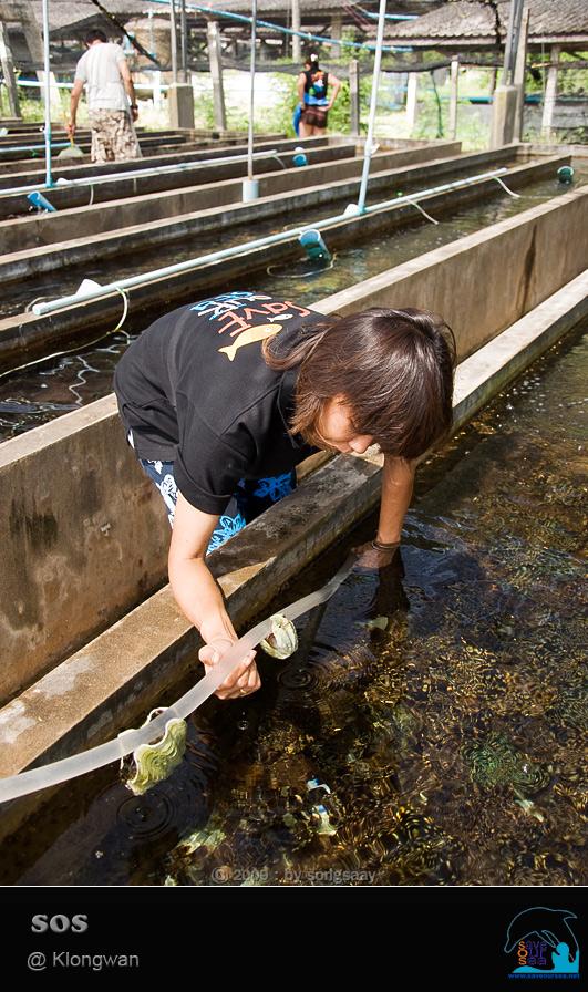 ระหว่างทาง ต้องเดินผ่านบ่อดินที่ใช้เลี้ยงปลานวลจันทร์ .... เป็นเวลาที่เจ้าหน้าที่กำลังให้อาหารพอดี