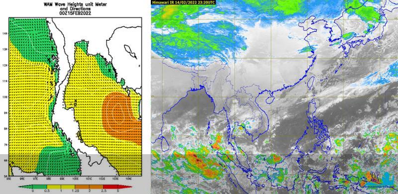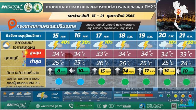 สภาวะอากาศทั่วไป บริเวณความกดอากาศสูงหรือมวลอากาศเย็นจากประเทศจีนได้แผ่ลงมาปกคลุมถึงภาคตะวันออกเฉียงเหนือของประเทศไทยและทะเลจีนใต้ ส่งผลให้ลมตะวันออกและลมตะวันออกเฉียงใต้พัดนำความชื้นจากทะเลจีนใต้และอ่าวไทยเข้ามาปกคลุมภาคเหนือตอนล่าง ภาคตะวันออกเฉียงเหนือ ภาคตะวันออก ภาคกลางรวมถึงกรุงเทพมหานครและปริมณฑล และภาคใต้ ลักษณะเช่นนี้ทำให้บริเวณดังกล่าวมีฝนฟ้าคะนองกับลมกระโชกแรงบางแห่ง โดยมีฝนตกหนักบางแห่งในภาคใต้ตอนบน ขอให้ประชาชนระวังอันตรายจากฝนฟ้าคะนอง ลมกระโชกแรง โดยหลีกเลี่ยงการอยู่ในที่โล่งแจ้ง ใต้ต้นไม้ใหญ่ และป้ายโฆษณาที่ไม่แข็งแรงไว้ด้วย กรุงเทพมหานครและปริมณฑล มีฝนฟ้าคะนอง ร้อยละ 40 ของพื้นที่ อุณหภูมิต่ำสุด 23-25 องศาเซลเซียส อุณหภูมิสูงสุด 30-34 องศาเซลเซียส ลมตะวันออกเฉียงใต้ ความเร็ว 10-20 กม./ชม. คาดหมาย ในช่วงวันที่ 14 ? 15 ก.พ. 65 บริเวณความกดอากาศสูงกำลังอ่อนจากประเทศจีนแผ่ลงมาปกคลุมภาคตะวันออกเฉียงเหนือและทะเลจีนใต้ ส่งผลทำให้มีลมใต้และลมตะวันออกเฉียงใต้พัดนำความชื้นจากทะเลจีนใต้และอ่าวไทยเข้ามาปกคลุมบริเวณภาคเหนือตอนล่าง ภาคตะวันออกเฉียงเหนือตอนล่าง ภาคกลางรวมทั้งกรุงเทพมหานครและปริมณฑล และภาคตะวันออก ทำให้บริเวณประเทศไทยตอนบนมีฝนฟ้าคะนองกับมีลมกระโชกแรงเกิดขึ้นได้บางพื้นที่ สำหรับภาคใต้มีหย่อมความกดอากาศต่ำปกคลุมบริเวณหัวเกาะสุมาตรา ประกอบกับลมตะวันออกที่พัดปกคลุมบริเวณอ่าวไทยและภาคใต้มีกำลังแรงขึ้น ทำให้ภาคใต้มีฝนเพิ่มขึ้น และมีฝนตกหนักบางแห่ง ส่วนในช่วงวันที่ 16-18 ก.พ. 65 บริเวณความกดอากาศสูงที่ปกคลุมภาคตะวันออกเฉียงเหนือ และทะเลจีนใต้ มีกำลังอ่อนลง ในขณะที่ลมใต้และลมตะวันออกเฉียงใต้ยังคงพัดปกคลุมประเทศไทยตอนบน ทำให้บริเวณดังกล่าวมีหมอกในตอนเช้า โดยมีฝนฟ้าคะนองบางแห่ง สำหรับลมตะวันออกยังคงพัดปกคลุมอ่าวไทยและภาคใต้ ทำให้ภาคใต้มีฝนฟ้าคะนอง และมีฝนตกหนักบางแห่ง หลังจากนั้นในช่วงวันที่ 19 - 20 ก.พ. 65 บริเวณความกดอากาศสูงอีกระลอกหนึ่งจากประเทศจีนจะแผ่ลงมาปกคลุมภาคตะวันออกเฉียงเหนือและทะเลจีนใต้ ส่งผลทำให้มีลมใต้และลมตะวันออกเฉียงใต้พัดนำความชื้นจากทะเลจีนใต้และอ่าวไทยเข้ามาปกคลุมภาคเหนือตอนล่าง ภาคตะวันออกเฉียงเหนือ ภาคกลางรวมทั้งกรุงเทพมหานครและปริมณฑล และภาคตะวันออก ทำให้บริเวณประเทศไทยตอนบนจะมีพายุฝนฟ้าคะนอง ลมกระโชกแรงบางแห่งเกิดขึ้นได้ สำหรับลมตะวันออกที่พัดปกคลุมอ่าวไทยและภาคใต้มีกำลังอ่อนลง ทำให้ภาคใต้มีฝนลดลง ข้อควรระวัง ในช