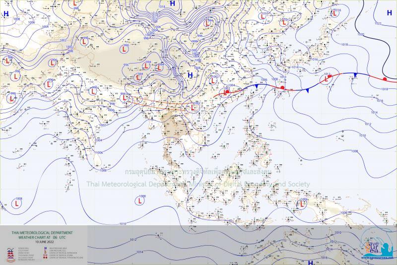 ในช่วงวันที่ 10 ? 13 มิ.ย. 65 มรสุมตะวันตกเฉียงใต้พัดปกคลุมทะเลอันดามัน ประเทศไทย และอ่าวไทย ประกอบกับร่องมรสุมพาดผ่านประเทศเมียนมาและประเทศลาวตอนบนเข้าสู่หย่อมความกดอากาศต่ำที่ปกคลุมบริเวณประเทศเวียดนามตอนบนและอ่าวตังเกี๋ย ทำให้ประเทศไทยตอนบนมีฝนน้อย ส่วนในช่วงวันที่ 14 - 16 มิ.ย. 65 ร่องมรสุมจะเลื่อนลงมาพาดผ่านตอนบนของภาคเหนือ และประเทศลาวตอนบน เข้าสู่หย่อมความกดอากาศต่ำบริเวณประเทศเวียดนามตอนบนและอ่าวตังเกี๋ย ประกอบกับมรสุมตะวันตกเฉียงใต้ที่พัดปกคลุมทะเลอันดามัน ภาคใต้ และอ่าวไทย จะมีกำลังแรงขึ้น ทำให้ประเทศไทยตอนบนมีฝนเพิ่มขึ้น และมีฝนตกหนักบางแห่งบริเวณภาคเหนือ ภาคตะวันออกเฉียงเหนือ ภาคกลาง ภาคตะวันออก และภาคใต้