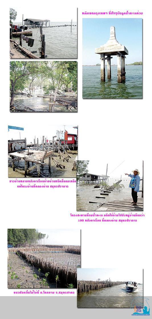 สำรวจฝั่งอ่าวไทย โลกร้อน-กัดเซาะ ![]() แนวเขื่อนไม้ไผ่ " ภาวะโลกร้อน" หรือ "Global Warming" เกิดจากอุณหภูมิของโลกที่ปรับสูงขึ้น อันเนื่องมาจากปริมาณก๊าซคาร์บอนไดออกไซด์ ที่มีส่วนสำคัญอย่างยิ่งทำให้เกิดภาวะก๊าซเรือนกระจก ผลกระทบที่ตามมา คืออุณหภูมิของโลกสูงขึ้น น้ำแข็งในขั้วโลกละลายรวดเร็ว เกิดความแห้งแล้งในหลายพื้นที่ ทะเลทรายขยายตัว พื้นที่เพาะปลูกลดน้อยลง ฤดูกาล และสภาพภูมิอากาศเปลี่ยนแปลง บางพื้นที่ระดับน้ำทะเลสูงขึ้น ทำให้ริมทะเล หรือเกาะต่างๆ จมหาย เมื่อปลายปีพ.ศ.2552 มีการประชุมรัฐภาคีกรอบอนุสัญญาสหประชาชาติ ว่าด้วยการเปลี่ยนแปลงสภาพภูมิอากาศสมัยที่ 15 และพิธีสารเกียวโตสมัยที่ 5 ที่ประเทศเดนมาร์ก มีมหาอำนาจหลายประเทศตัวการปล่อยก๊าซเรือนกระจก รวมถึงประเทศไทย เข้าร่วมด้วย แต่สุดท้ายไม่สามารถหาข้อสรุปที่ชัดเจนในการแก้ไขปัญหาได้ จึงต้องรอการประชุมที่ประเทศเม็กซิโก ในปีพ.ศ.2553 ว่า จะได้ข้อสรุปอย่างไร ส่วนประเทศไทยยังคงปฏิบัติตามแผนพัฒนาเศรษฐกิจ และสังคมแห่งชาติฉบับที่ 11 เรื่องการใช้พลังงานทดแทน การอนุรักษ์ทรัพยากรป่าไม้ และปลูกป่าทดแทน โดยเฉพาะป่าชายเลน โดยกระทรวงทรัพยากรธรรมชาติและสิ่งแวดล้อม เป็นหน่วยงานหลักที่จะต้องปฏิบัติตามแผนนโยบายนี้ ล่าสุดยกคณะลงเรือสำรวจพื้นที่ป่าชายเลน ตั้งแต่คลองบางขุนเทียน กรุงเทพฯ เรื่อยไปจนถึง ต.โคกขาม อ.เมือง จ.สมุทรสาคร เป็นพื้นที่ที่ได้รับผลกระทบจากน้ำทะเลกัดเซาะชายฝั่ง มากแห่งหนึ่ง ![]() 1.เวทีแลกเปลี่ยนข้อมูล 2.หลักเขตกรุงเทพฯ 3.นายสุวิทย์ คุณกิตติ 4.ลุงทวีปพาดูแนวเขื่อนไม้ไผ่ 5.น้ำทะเลกัดเซาะตลิ่ง 6.คลองพิทยาลงกรณ์ เริ่มจากคลองพิทยาลงกรณ์ เขตบางขุนเทียน ระยะทาง 3 กิโลเมตร ก่อนเลี้ยวขวาล่องไปตามคลองขุนราชพินิจใจ ระยะทาง 4 กิโลเมตร ถึงปากคลองบางขุนเทียนออกอ่าวไทย บริเวณนี้จะพบหลักกิโลเมตรที่ 28 กรุงเทพฯ จากนั้นแล่นเรือเลาะไปตามชายฝั่งอ่าวไทย สำรวจเรื่อยไปเป็นระยะทาง 10 กิโลเมตร จนถึงศูนย์อนุรักษ์ทรัพยากรทางทะเล และชาวฝั่งที่ 2 ต.โคกขาม จากการสำรวจทั้ง 2 ฝั่งคลอง และชายฝั่ง พบว่าป่าชายเลนลดลงเป็นอย่างมาก บางพื้นที่ชาวบ้านต้องทำเขื่อนเชื่อมคันดิน เพื่อไม่ให้น้ำทะเลท่วมทะลักเข้ามา แต่บางช่วงเป็นพื้นที่ต่ำ น้ำทะเลทะลักเข้ามาในพื้นที่อยู่อาศัยเป็นอาณาบริเวณกว้าง นายทวีป เมตสุวรรณ อายุ 58 ปี ประธานชุมชนคลองพิทยาลงกรณ์ ให้ข้อมูลว่า อาศัยอยู่ที่นี่มาตั้งแต่เกิด ได้เห็นความเปลี่ยนแปลงของระบบนิเวศบริเวณนี้มาทั้งชีวิต โดยเฉพาะป่าชายเลนที่เมื่อก่อนมีความ