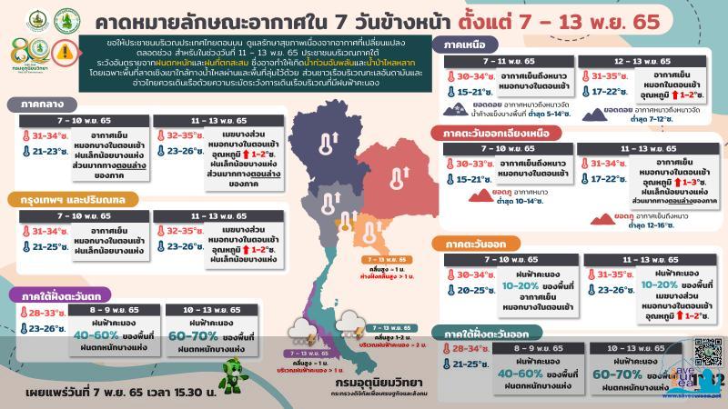 สภาวะอากาศทั่วไป พยากรณ์อากาศ 24 ชั่วโมงข้างหน้า ร่องมรสุมพาดผ่านภาคใต้ตอนล่างเข้าสู่หย่อมความกดอากาศต่ำเหนือเกาะสุมาตรา ประกอบกับมรสุมตะวันออกเฉียงเหนือและลมตะวันออกที่พัดปกคลุมภาคใต้ อ่าวไทย และทะเลอันดามันมีกำลังอ่อนลง ลักษณะเช่นนี้ทำให้ภาคใต้มีฝนลดลง แต่ยังคงมีฝนฟ้าคะนองเกิดขึ้นได้ สำหรับบริเวณความกดอากาศสูงหรือมวลอากาศเย็นกำลังปานกลางยังคงปกคลุมประเทศไทยตอนบน ทำให้ประเทศไทยตอนบนยังคงมีอากาศเย็นถึงหนาว กับมีหมอกบางในตอนเช้า ขอให้ประชาชนดูแลรักษาสุขภาพเนื่องจากสภาพอากาศที่เปลี่ยนแปลงไว้ด้วย กรุงเทพมหานครและปริมณฑล เมฆบางส่วนกับมีหมอกบางในตอนเช้า อุณหภูมิต่ำสุด 22-25 องศาเซลเซียส อุณหภูมิสูงสุด 32-34 องศาเซลเซียส ลมตะวันออกเฉียงเหนือ ความเร็ว 10-20 กม./ชม. คาดหมาย ในช่วงวันที่ 8 ? 9 พ.ย. 65 บริเวณความกดอากาศสูงหรือมวลอากาศเย็นกำลังปานกลางปกคลุมประเทศไทยตอนบน ทำให้ประเทศไทยตอนบนมีอากาศเย็นถึงหนาวกับมีหมอกในตอนเช้า โดยมีฝนเล็กน้อยบางแห่งในภาคตะวันออก สำหรับร่องมรสุมยังคงพาดผ่านบริเวณภาคใต้ตอนล่าง ในขณะที่มรสุมตะวันออกเฉียงเหนือและลมตะวันออกที่พัดปกคลุมอ่าวไทย ภาคใต้ และทะเลอันดามันมีกำลังอ่อนลง ทำให้ภาคใต้มีฝนลดลง แต่ยังคงมีฝนตกหนักบางแห่ง ส่วนในช่วงวันที่ 10 ? 14 พ.ย. 65 บริเวณความกดอากาศสูงหรือมวลอากาศเย็นกำลังปานกลางที่ปกคลุมประเทศไทยตอนบนเริ่มมีกำลังอ่อนลง ในขณะที่มีลมตะวันออกพัดปกคลุมภาคตะวันออกเฉียงเหนือตอนล่าง ภาคกลางตอนล่างรวมทั้งกรุงเทพมหานครและปริมณฑล และภาคตะวันออก ลักษณะเช่นนี้ทำให้ประเทศไทยตอนบนยังคงมีอากาศเย็น กับมีหมอกในตอนเช้า และอุณหภูมิจะสูงขึ้น 1-3 องศาเซลเซียสในภาคเหนือ ภาคกลาง และภาคตะวันออก ส่วนภาคตะวันออกเฉียงเหนืออุณหภูมิจะสูงขึ้น 2-4 องศาเซลเซียส โดยมีฝนบางแห่งบริเวณภาคตะวันออกเฉียงเหนือตอนล่าง ภาคกลางตอนล่าง รวมทั้งกรุงเทพมหานครและปริมณฑล และภาคตะวันออก สำหรับหย่อมความกดอากาศต่ำปกคลุมประเทศมาเลเซีย ในขณะที่มรสุมตะวันออกเฉียงเหนือและลมตะวันออกที่พัดปกคลุมอ่าวไทย ภาคใต้ และทะเลอันดามันจะมีกำลังแรงขึ้น ทำให้ภาคใต้มีฝนเพิ่มขึ้นและมีฝนตกหนักบางแห่ง ข้อควรระวัง ขอให้ประชาชนบริเวณประเทศไทยตอนบนดูแลรักษาสุขภาพเนื่องจากอากาศที่เปลี่ยนแปลงไว้ด้วย ตลอดช่วง สำหรับในช่วงวันที่ 11 ? 14 พ.ย. 65 ประชาชนบริเวณภาคใต้ระวังอันตรายจากฝนตกหนักและฝนที่ตกสะสม ซึ่งอาจทำให้เกิดน้ำท่วมฉับพลันและน้ำป่าไหลหลาก โดยเฉพาะพื้นที่ลาดเชิงเขาใกล้ทางน้ำไหลผ่านและ