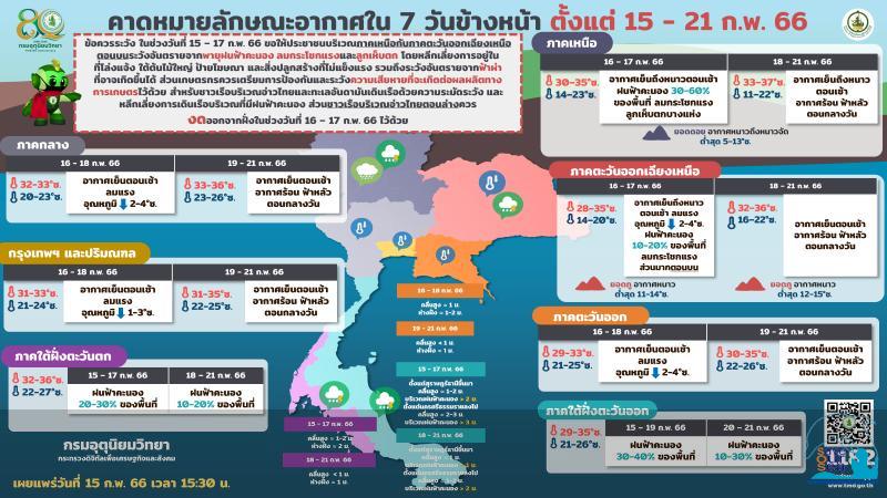 สภาวะอากาศทั่วไป พยากรณ์อากาศ 24 ชั่วโมงข้างหน้า คลื่นกระแสลมฝ่ายตะวันตกจะเคลื่อนผ่านภาคเหนือ ในช่วงวันที่ 16 ? 17 ก.พ. 66 ทำให้ภาคเหนือ มีพายุฝนฟ้าคะนอง ลมกระโชกแรง และลูกเห็บตกบางแห่ง ขอให้ประชาชนระมัดระวังอันตรายดังกล่าว โดยหลีกเลี่ยงการอยู่ในที่โล่งแจ้ง ใต้ต้นไม้ใหญ่ ป้ายโฆษณา และสิ่งปลูกสร้างที่ไม่แข็งแรง สำหรับเกษตรกรควรเตรียมการป้องกันและระวังความเสียหายที่จะเกิดต่อผลผลิตทางการเกษตรไว้ด้วย และดูแลสุขภาพเนื่องจากสภาพอากาศที่เปลี่ยนแปลงในระยะนี้ ส่วนบริเวณความกดอากาศสูงกำลังค่อนข้างแรงจากประเทศจีนปกคลุมภาคตะวันออกเฉียงเหนือ ภาคกลาง ภาคตะวันออก และภาคเหนือตอนล่าง ทำให้ประเทศไทยตอนบนมีอากาศเย็นในตอนเช้า โดยมีลมแรงในภาคตะวันออกเฉียงเหนือ และภาคตะวันออก สำหรับลมตะวันออกและลมตะวันออกเฉียงใต้ที่พัดปกคลุมอ่าวไทย ภาคใต้ และทะเลอันดามันจะมีกำลังแรงขึ้น ทำให้ภาคใต้มีฝนเพิ่มขึ้น และคลื่นลมบริเวณอ่าวไทยมีกำลังค่อนข้างแรง โดยอ่าวไทยตอนล่างมีคลื่นสูง 2 - 3 เมตร บริเวณที่มีฝนฟ้าคะนองคลื่นสูงมากกว่า 3 เมตร ขอให้ชาวเรือบริเวณอ่าวไทยเพิ่มความระมัดระวังในการเดินเรือ หลีกเลี่ยงการเดินเรือในบริเวณที่มีฝนฟ้าคะนอง และเรือเล็กควรงดออกจากฝั่งในช่วงเวลาดังกล่าว ฝุ่นละอองในระยะนี้: ภาคเหนือมีการสะสมฝุ่นละออง/หมอกควันมากเนื่องจากมีการระบายอากาศไม่ดี ส่วนภาคอื่นๆ มีฝุ่นละอองสะสมอยู่ในเกณฑ์เล็กน้อยถึงปานกลาง เนื่องจากลมที่พัดปกคลุมมีกำลังแรงขึ้น กรุงเทพมหานครและปริมณฑล มีเมฆบางส่วน อุณหภูมิต่ำสุด 23-25 องศาเซลเซียส อุณหภูมิสูงสุด 30-32 องศาเซลเซียส ลมตะวันออกเฉียงใต้ ความเร็ว 10-20 กม./ชม. คาดหมาย ในช่วงวันที่ 15 ? 17 ก.พ. 66 บริเวณความกดอากาศสูงหรือมวลอากาศเย็นกำลังค่อนข้างแรงจากประเทศจีนแผ่ลงมาปกคลุมประเทศไทยตอนบนและทะเลจีนใต้ ในขณะที่ในช่วงวันที่ 16 ? 19 ก.พ. 66 คลื่นกระแสลมฝ่ายตะวันตกจะเคลื่อนผ่านภาคเหนือและภาคตะวันออกเฉียงเหนือตอนบน ทำให้บริเวณดังกล่าวจะมีพายุฝนฟ้าคะนอง ลมกระโชกแรง และลูกเห็บตกบางแห่งเกิดขึ้นในระยะแรก หลังจากนั้นบริเวณประเทศไทยตอนบนอุณหภูมิจะลดลงกับมีลมแรง โดยอุณหภูมิจะลดลง 2 ? 4 องศาเซลเซียส สำหรับลมตะวันออกและลมตะวันออกเฉียงใต้ที่พัดปกคลุมอ่าวไทย ภาคใต้ และทะเลอันดามันจะมีกำลังแรงขึ้น ทำให้ภาคใต้มีฝนเพิ่มขึ้น ส่วนคลื่นลมบริเวณอ่าวไทยและทะเลอันดามันจะมีกำลังแรงขึ้น โดยอ่าวไทยตอนบนและทะเลอันดามันมีคลื่นสูง 1 ? 2 เมตร อ่าวไทยตอนล่างมีคลื่นสูง 2 - 3 เมตร บริเวณที่มีฝนฟ้าคะนองค