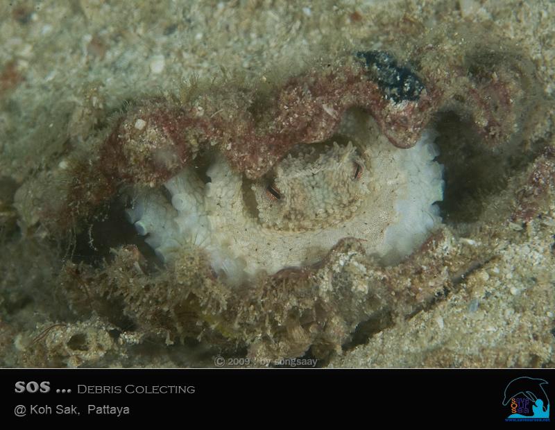 ตามเปลือกหอยนางรม หรือหอยมือหมีที่จมทรายอยู่ครึ่งหนึ่ง มักจะมีหมึกสายหรือ Octopus ตัวเล็กๆหน้าตาน่ารักน่าเอ็นดูอาศัยอยู่...