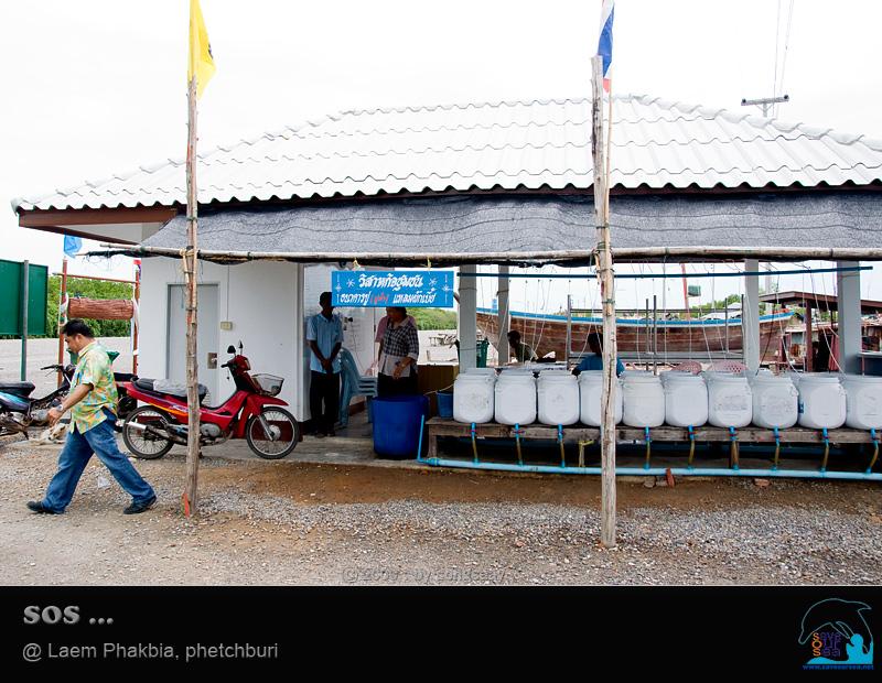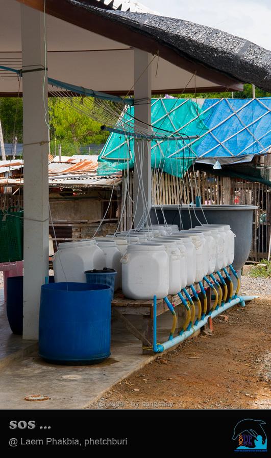 ใช้วิธีและวัสดุง่ายๆ เป็นภูมิปัญญาชาวบ้านผสมคำแนะนำของ ผอ. ครับ ถังใหญ่ เป็นถังเก็บน้ำทะเล ให้ตกตะกอน แล้วจึงนำไปถ่ายใส่ถังปูใบขาวๆอีกที ส่วนน้ำที่เลิกใช้ก็จะปล่อยลงท่อ ที่ต่อไปลงคลองโดยตรง