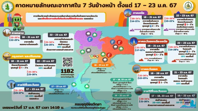 สภาวะอากาศทั่วไป พยากรณ์อากาศ 24 ชั่วโมงข้างหน้า บริเวณความกดอากาศสูงกำลังปานกลางที่ปกคลุมภาคตะวันออกเฉียงเหนือและทะเลจีนใต้เริ่มมีกำลังอ่อนลง ในขณะที่ลมฝ่ายตะวันตกในระดับบนปกคลุมภาคเหนือ ลักษณะเช่นนี้ทำให้บริเวณภาคเหนือ ภาคตะวันออกเฉียงเหนือ ภาคกลาง ภาคตะวันออก และภาคใต้ตอนบนยังคงมีอากาศเย็นในตอนเช้า สำหรับมรสุมตะวันออกเฉียงเหนือที่พัดปกคลุมอ่าวไทยและภาคใต้เริ่มมีกำลังอ่อนลง แต่ยังคงทำให้ภาคใต้ตอนล่างมีฝนฟ้าคะนองบางแห่ง ส่วนบริเวณอ่าวไทยตอนล่างทะเลมีคลื่นสูง 1 - 2 เมตร บริเวณที่มีฝนฟ้าคะนองคลื่นสูงมากกว่า 2 เมตร ขอให้ชาวเรือบริเวณอ่าวไทยตอนล่างหลีกเลี่ยงการเดินเรือในบริเวณที่มีฝนฟ้าคะนองไว้ด้วย ฝุ่นละอองในระยะนี้: ภาคเหนือตอนล่าง ภาคกลางรวมทั้งกรุงเทพมหานครและปริมณฑล และภาคตะวันออกมีการสะสมของฝุ่นละออง/หมอกควันปานกลางถึงมาก เนื่องจากลมที่พัดปกคลุมมีกำลังอ่อนลง และการระบายของอากาศอยู่ในเกณฑ์ที่ไม่ดี กรุงเทพมหานครและปริมณฑล เมฆบางส่วน อุณหภูมิต่ำสุด 24-25 องศาเซลเซียส อุณหภูมิสูงสุด 33-35 องศาเซลเซียส ลมตะวันออกเฉียงเหนือ ความเร็ว 10-15 กม./ชม. คาดหมาย ในช่วงวันที่ 18 - 21 ม.ค. 67 บริเวณความกดอากาศสูงหรือมวลอากาศเย็นกำลังปานกลางที่ปกคลุมภาคตะวันออกเฉียงเหนือและทะเลจีนใต้จะมีกำลังอ่อนลง ในขณะที่ลมตะวันตกในระดับบนพัดปกคลุมประเทศไทยตอนบนทำให้ภาคเหนือมีอากาศเย็นถึงหนาว โดยอุณหภูมิจะลดลง 2 - 4 องศาเซลเซียส ส่วนภาคอื่นๆ ยังคงมีอากาศเย็นในตอนเช้า ส่วนในวันที่ 22 - 23 ม.ค. 67 บริเวณความกดอากาศสูงหรือมวลอากาศเย็นกำลังปานกลางระลอกใหม่จากประเทศจีนจะแผ่ลงมาปกคลุมภาคตะวันออกเฉียงเหนือ จะทำให้ภาคตะวันออกเฉียงเหนือมีอุณหภูมิลดลง 1 - 3 องศาเซลเซียส กับมีลมแรง ส่วนภาคกลางตอนล่างและภาคตะวันออกมีฝนฟ้าคะนองบางพื้นที่ในระยะแรก ในช่วงวันที่ 17 - 18 ม.ค. 67 มรสุมตะวันออกเฉียงเหนือกำลังปานกลางพัดปกคลุมอ่าวไทยและภาคใต้ ทำให้ภาคใต้ตอนล่างมีฝนฟ้าคะนองบางแห่ง ส่วนคลื่นลมบริเวณอ่าวไทยตอนล่างมีกำลังปานกลาง โดยมีคลื่นสูงประมาณ 2 เมตร บริเวณที่มีฝนฟ้าคะนองคลื่นสูงมากกว่า 2 เมตร ส่วนในช่วงวันที่ 19 - 23 ม.ค. 67 มรสุมตะวันออกเฉียงเหนือที่พัดปกคลุมอ่าวไทยและภาคใต้จะมีกำลังอ่อนลง ส่งผลให้ภาคใต้มีฝนลดลง อ่าวไทยตอนล่างมีคลื่นสูง 1 - 2 เมตร และบริเวณที่มีฝนฟ้าคะนองคลื่นสูงมากกว่า 2 เมตร ข้อควรระวัง ชาวเรือบริเวณอ่าวไทยและทะเลอันดามันควรเดินเรือด้วยความระมัดระวังและหลีกเลี่ยงการเดินเรือในบริเวณที่มีฝนฟ้าคะนอง ตลอดช่วง |