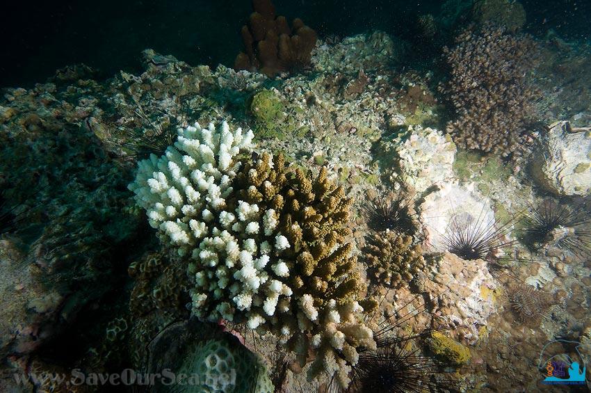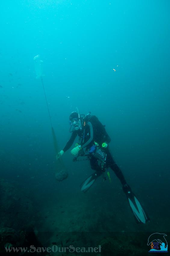 นอกจากอวนแล้ว สองสายยังพบปะการังขาวเป็นหย่อมๆ จะเป็นฝีมือใครไปได้ นอกจากดาวมงกุฏหนาม ที่เพิ่มปริมาณมากขึ้นเรื่อยๆที่หินแพ