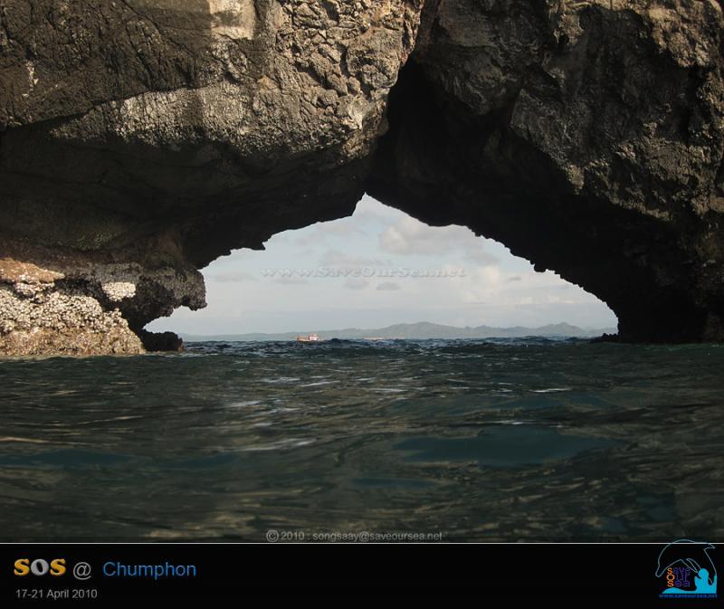เราลอยตัวขึ้นมาที่ผิวน้ำบริเวณโพรงทะลุ..... เรือลำเล็กๆแล่นผ่านมาพอดี....สวยดีค่ะ...