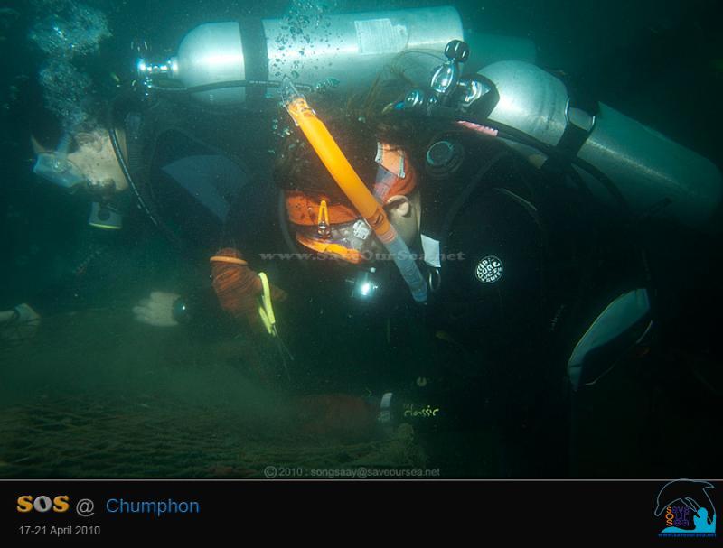 พอใส่ลมเข้าไปในถุงได้นิดเดียว....ลอบก็ลอยละลิ่วขึ้นไปบนผิวน้ำที่อยู่ห่างขึ้นไปเพียง 10 เมตร.....ไม่ทันที่เราจะค่อยๆนำไปวางบนพื้นทรายเบื้องล่าง ตามที่ได้วางแผนไว้ เราเลยต้องให้ดิ้งกี้ลากลอบออกไปปลดทิ้งในที่ไกลๆจากกองหิน....