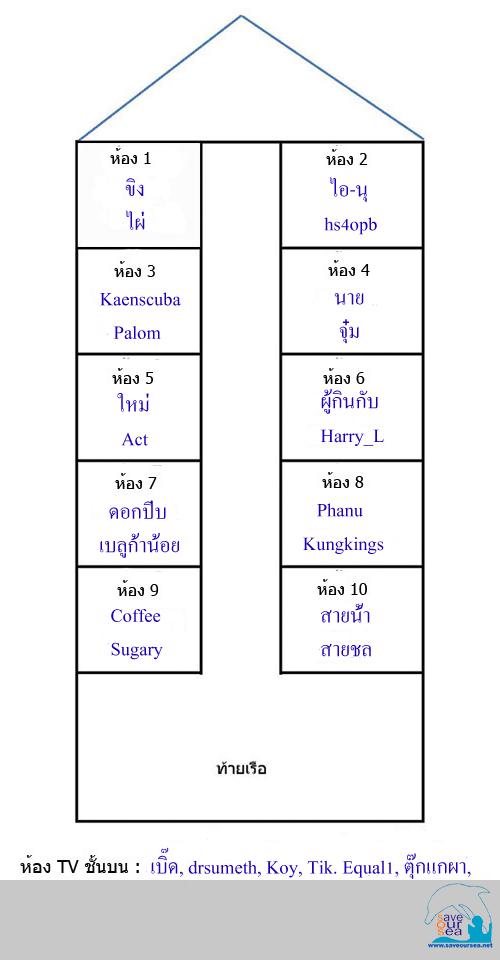 วันนี้ พอจะมีเวลาแล้ว ขอสรุปเรื่องห้องและกลุ่มดำน้ำเลย ..... หากใครอยากปรับเปลี่ยนอย่างไร บอกมาได้นะครับ ห้องนอน ห้อง 1 .......... ขิง - ไผ่ ห้อง 2 .......... ไอนุ- hs4opb ห้อง 3 .......... Kaenscuba - Som_Lomwong ห้อง 4 .......... นาย - จุ๋ม ห้อง 5 .......... ใหม่ - Act ห้อง 6 .......... ผู้กินกับ - Harry_L ห้อง 7 .......... ดอกปีบ - เบลูก้าน้อย ห้อง 8 .......... Phanu - Kungkings ห้อง 9 .......... Coffee - Sugary ห้อง 10 .......... สายน้ำ - สายชล ห้อง TV .......... เบิ๊ด, drsumeth, Koy, Tik, Equal1, ตุ๊กแกผา