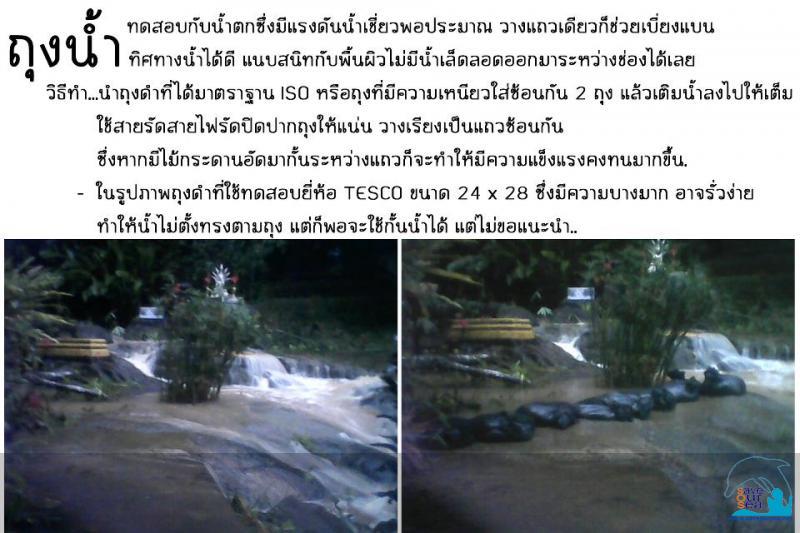 น่าสนใจครับ ใช้น้ำต้านน้ำ แต่ถุง/สายยางยาวสำหรับใส่น้ำไว้สกัดน้ำอย่างนั้นไม่รู้จะไปหาที่ไหน วันก่อนในเฟซบุ๊คเห็นคนเขาดัดแปลงเอาถุงดำมาเป็นตัวสกัด/เบี่ยงเบนน้ำ ไม่ทราบจะได้ผลหรือเปล่า และต้องหาอะไรมากั้นด้านหน้าถุงไม่ให้สิ่งของแหลมคมที่ไหลมากับน้ำ มาเจาะถุงดำทะลุได้ ตามรูปนี้ครับ เครดิต Anupong รักและเทิดทูนในหลวง