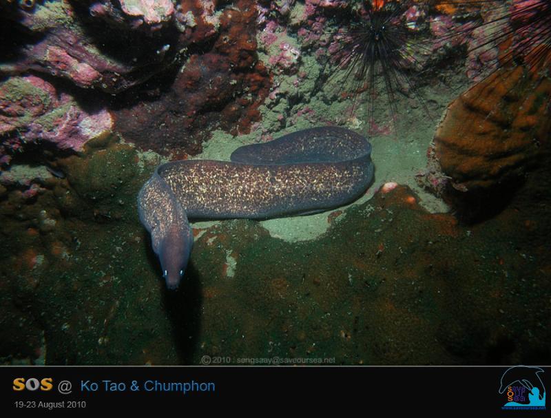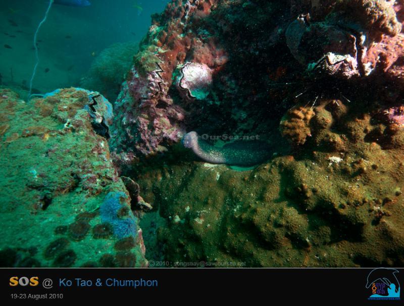 หากโชคดี...เราอาจจะได้เห็นสัตว์ทะเลน่ารักๆออกมาโชว์ตัวให้เราได้ยล ดังเช่นเจ้าปลาไหลมอเรย์ตาขาวตัวนี้ ที่ออกมานอนอยู่นอกโพรงให้เราได้ดูอย่างใกล้ชิด...