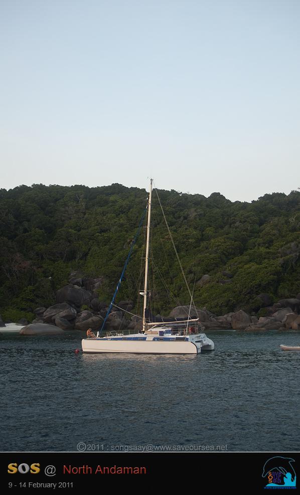 หลังจากดำน้ำที่หินหัวกระโหลกแล้ว...เรือแล่นไปจอด ที่เกาะ 9 บริเวณที่น้องชายเรียกว่า "อ่าวนำชัย" หรือที่ฝรั่งเรียกว่า "Bommie" เพื่อให้น้องๆได้ดำน้ำกลางคืน มีเรือใบฝรั่งจอดอยู่.....สวยดีค่ะ