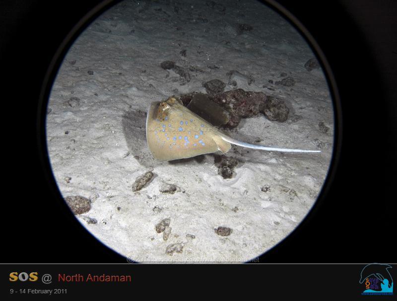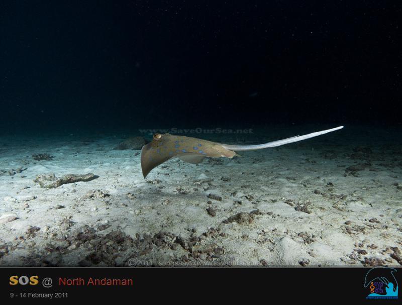 ระหว่างเคลื่อนตัวจากกองหินหนึงไปยังอีกกองหินหนึ่ง....มีสัตวว์ตัวเล็กที่น่าสนใจให้ดูมากมาย เช่น ปลาไหลสวน ทากทะเล ปลาบู่.... แต่น่าเสียดาย...ที่สองสายใช้เลนส์มุมกว้างกันทั้งคู่ เราเลยได้เพียงภาพปลากระเบนจุดฟ้า (Blue-spotted Stingray) หลายตัว ที่นอนพักบ้าง และบินร่อนไปมาบ้าง อยู่เหนือพื้นทราย ตัวเล็ก..แต่เงี่ยงที่หางนั่น ก็ทำให้คนถูกเงี่ยงแทง เจ็บปวดแสนสาหัส....