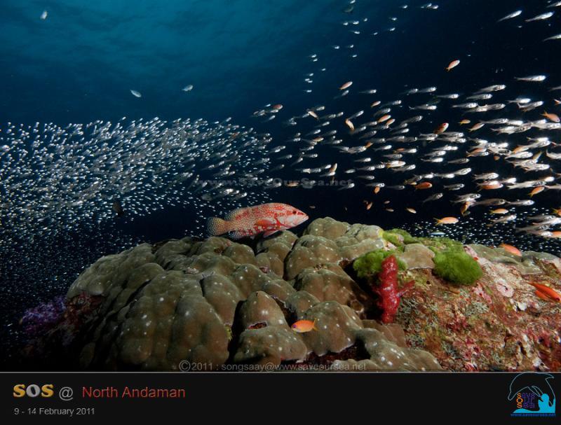 ต้นไม้สามต้น (Three Trees) เกาะ 9 วันสุดท้ายของการดำน้ำทำงานในครั้งนี้มาถึงแล้ว.... เราตื่นกันแต่เช้ามืด เพื่อจะรีบลงดำน้ำไดฟ์แรกและไดฟ์ต่อๆไปให้เร็วกว่าปกติ เพื่อที่จะให้สมาชิกที่จะต้องรีบกลับบ้านในเย็นวันนี้ถึงฝั่งให้เร็วที่สุด และพวกที่จะกลับเครื่องบินในวันรุ่งขึ้น มีเวลาพักบนบก 24 ชั่วโมง ก่อนการเดินทาง เราเตรียมตัวลงดำน้ำกันตั้งแต่ก่อน 7 โมงเช้า ตอนที่ลงดำน้ำ ดวงอาทิตย์ยังไม่โผล่มาให้เห็น จึงเป็นการดำน้ำแบบ Early Morning ที่ใต้น้ำยังมืดมัว ต้องใช้ไฟฉายส่องดูนู่นดูนี่เหมือนลงดำน้ำกลางคืน กองหินที่อยู่เป็นหย่อมๆ ที่จุดดำน้ำแห่งนี้ เหมือนกับสวนญี่ปุ่น มีปะการังอ่อนสีแดงสดญี่ปุ่นใสเหมือนโคม และปลามากมายดั่งสายฝน....