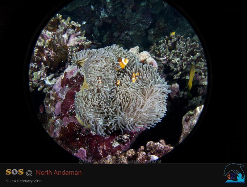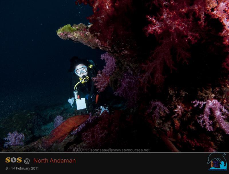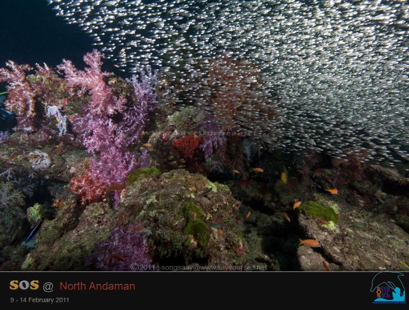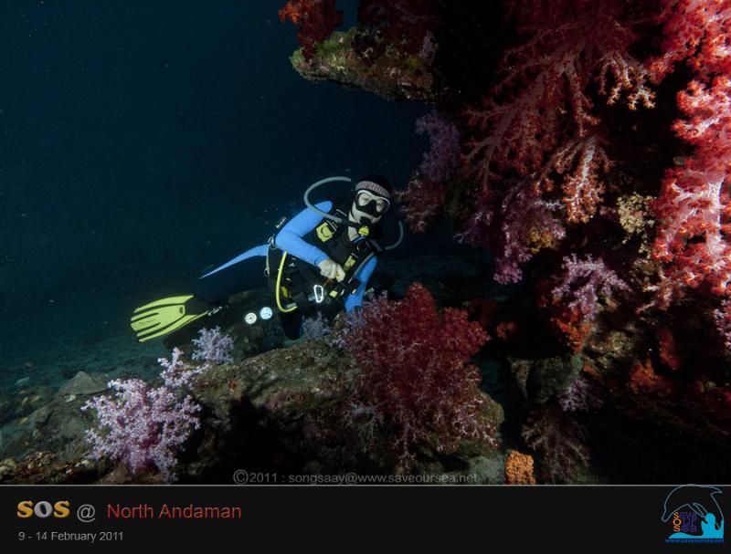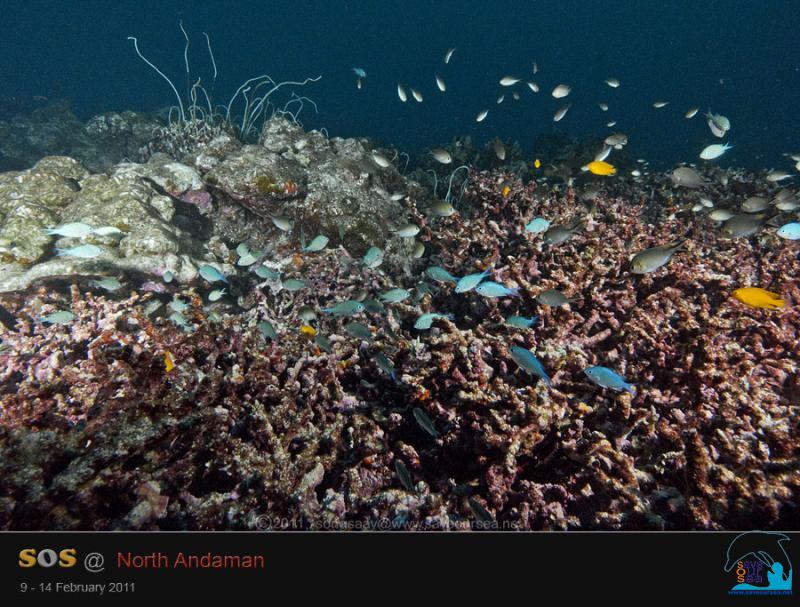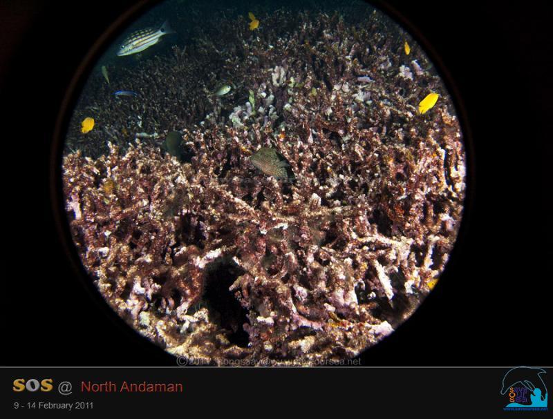 เมื่อไต่ระดับเข้าไปในแนวปะการังเขตน้ำตื้นเพื่อเตรียมพักน้ำ....เราได้เห็นแนวปะการังที่เสียหายกว่าร้อยละ 70 ของพื้นที่ ปะการังแข็งโดยเฉพาะปะการังกิ่งประเภทเขากวางตายไปเกือบหมด เห็นแต่แส้ทะเลสีขาวที่ยังคงสวยและสมบูรณ์อยู่...