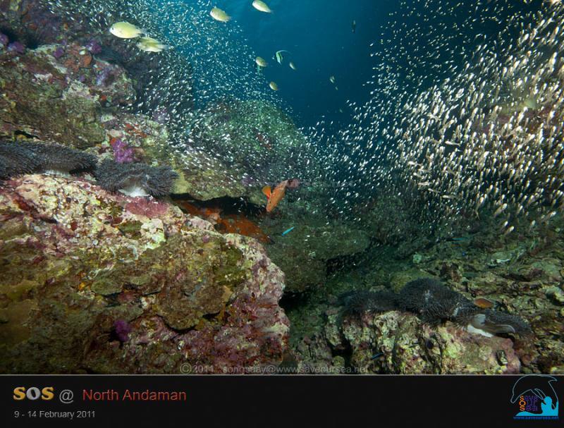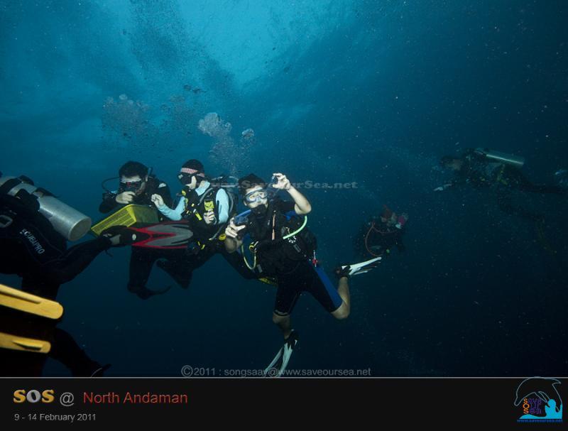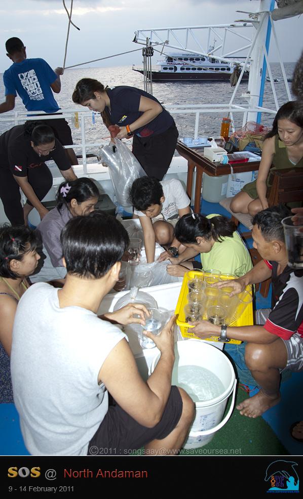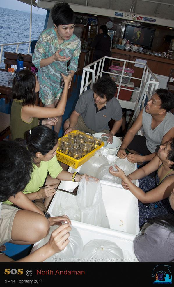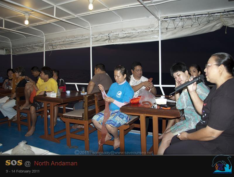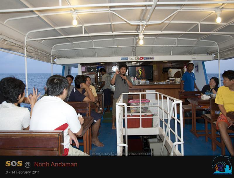 สองสายและอาสมัคร SOS อีก 21 คน ไปลงเรือครบเมื่อเกือบสี่ทุ่ม.... เรือเริ่มเคลื่อนออกจากท่าเรือทับละมุ มุ่งหน้าออกปากอ่าว เสียงจุดประทัดดังปุ้งปั้งแสบแก้วหู นัยว่าเป็นการคารวะและบอกกล่าวแม่ย่านางเรือและเจ้าที่เจ้าทางในบริเวณนั้น ให้ช่วยปกป้องคุ้มครองให้การเดินเรือเป็นไปด้วยความราบรื่น ปลอดภัย ทะเลเรียบเป็นกระจก.....คืนนั้นเรือจึงวิ่งราบเรียบ ก่อนนอน เรามีการแนะนำตัว และ ประชุมร่วมกันเกี่ยวกับกำหนดการปฏิบัติงานในวันรุ่งขึ้น และระเบียบการใช้ชีวิตบนเรือ และการแบ่งกลุ่มดำน้ำ เสร้จแล้ว...ต่างคนต่างแยกย้ายกันไปนอนอย่างสบายในห้องนอนของตัวเอง ตอนตีสี่กว่าๆ เรือก็จอดสนิท ไม่ไกลจากกองหินริเชลิวนัก.... ฟ้ายังมืดอยู่เลยค่ะ แต่พวกเราสมาชิก SOS ก็ตื่นขึ้นมานั่งรอรับแสงอรุณกันตั้งแต่ 6 โมงเช้า เวลาผ่านไปอีกครึ่งชั่วโมง เราก็ขึ้นมานั่งกันครบ หัวหน้า Dive Leader นำโดยน้องกบ Angel Frog น้องติ๊ก และน้องติ่ง ก็เริ่มสรุปถึงเรื่องแผนการดำน้ำทำงานอย่างปลอดภัยตามวิธีของพวกเราชาว SOS โดยมีน้องชาย ตัวแทนที่คุณเสรีส่งมาช่วยดูแลเราอย่างดียิ่ง เป็นผู้ช่วยอธิบายเรื่องจุดดำน้ำ