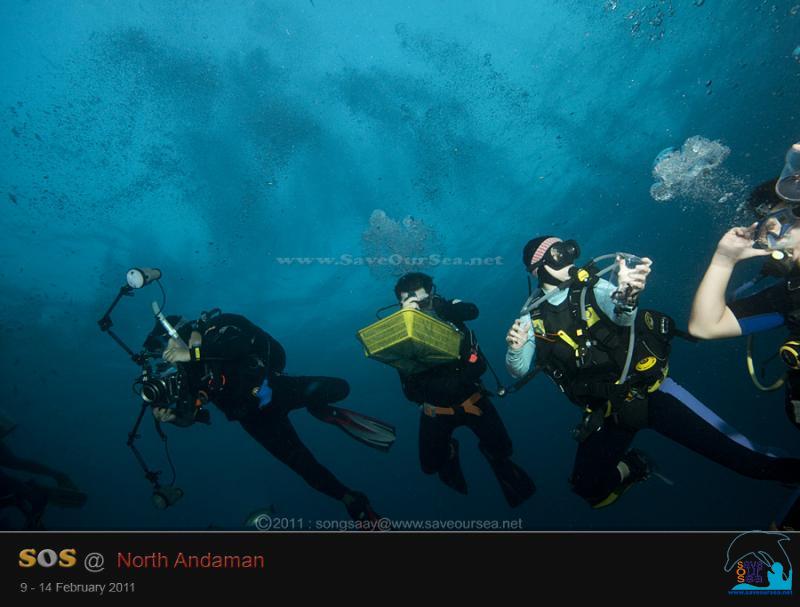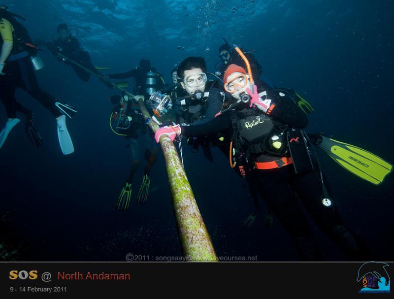 นักดำน้ำ sos กลุ่มน้องติ๊ก ลงน้ำไปก่อนพร้อมสองสายและน้องชาย โดยน้องติ๊กหอบตะกร้าใส่ถ้วยม้าน้ำลงไปด้วย 18 ถ้วย ที่เหลืออีก 2 ถ้วย ให้น้องชายถือลงไป กลุ่มแรกต้องเกาะสายทุ่นรอจนกว่ากลุ่มที่เหลือทะยอยลงน้ำจนครบ เมื่อครบแล้ว สายชลก็พาลัดเลาะตัดไปออกตรงบริเวณที่เราตั้งเป้าหมายที่จะปล่อยม้าน้ำ ซึ่งเต็มไปด้วยกัลปังหาพัด และแส้ทะเล เมื่อถึงที่หมาย....นักดำน้ำลูกทีมทุกคนได้รับแจกถ้วยใส่ม้าน้ำเพื่อนำไปปล่อย....