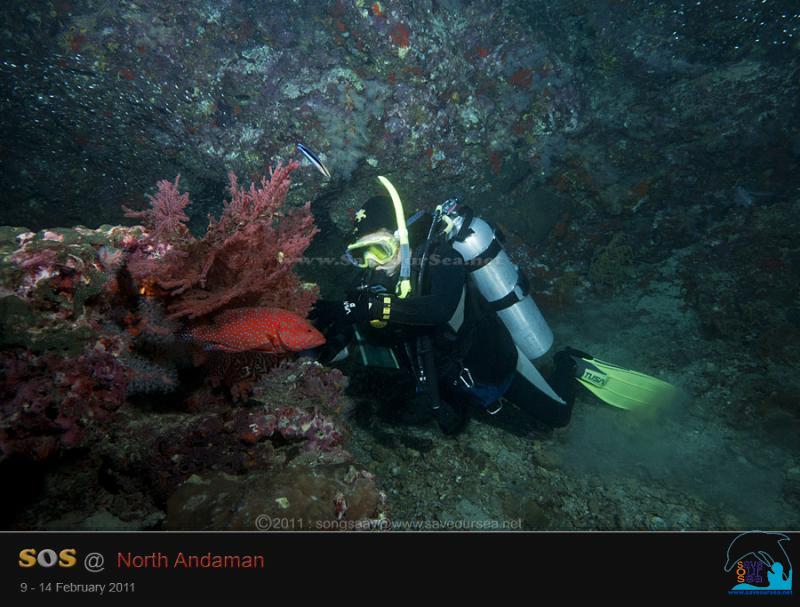 ถึงเวลาลงน้ำกันแล้วค่ะ..... น้ำในเช้าวันนั้น ใสแจ๋วไร้ตะกอน แม้ท้องน้ำจะยังสลัวเลือนลางเพราะแสงแดดยังไม่แรงกล้า เราก็ยังพอจะเห็นความงามใต้ทะเลที่ริเชลิวได้กระจ่างแจ้ง ปะการังอ่อนหลากสีสันขึ้นสลอนอยู่บนกองหิน ปลาตัวเล็กตัวน้อยแหวกว่ายไปมาอยู่ทั่วไป เหมือนกากเพชรที่ถูกโปรยเกลื่อนท้องน้ำ.... ปลาเก๋าจุดฟ้า ปักหลักตั้งป้อมจับลูกปลาตัวเล็กๆเหล่านั้นกินเป็นอาหาร...