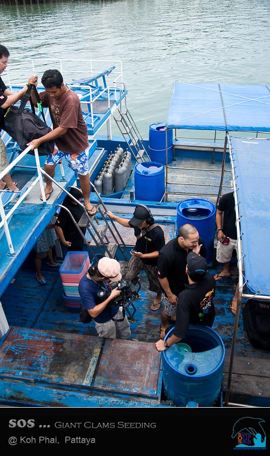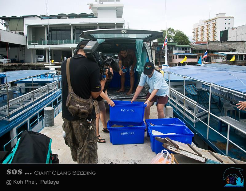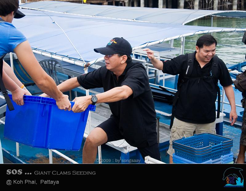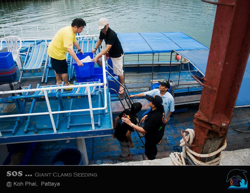 กระบะใส่หอยมือเสือทั้ง 500 ตัว ถูกขนขึ้นไปบนเรือมารีน น้องดู๋และน้องบ๊วย ได้ร่วมกับสมาชิกหญิงชายของ sos ที่แข็งแรง ขนกระบะน้องหอยขึ้นเรือมารีน 1 ที่จอดเทียบท่าอยู่....