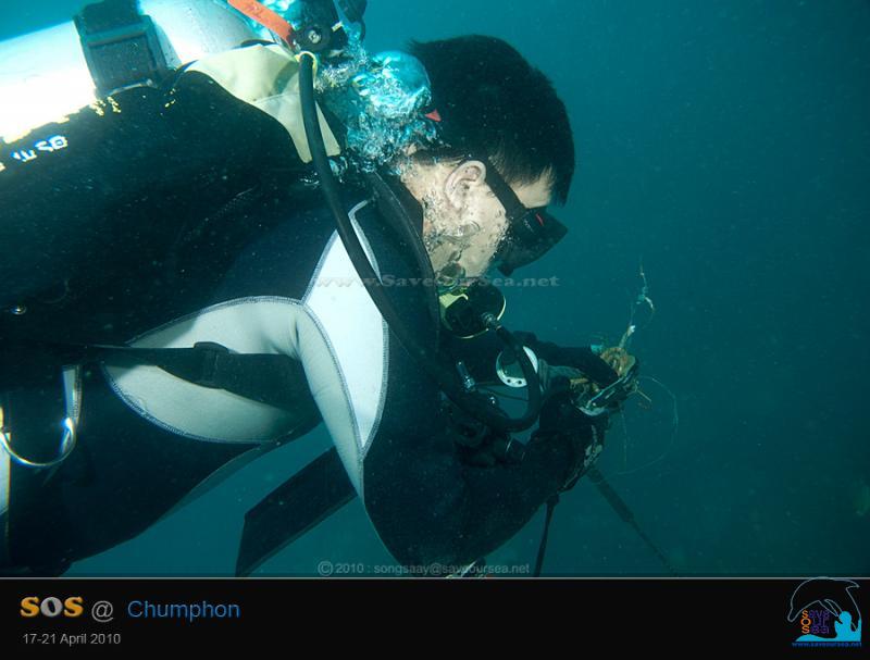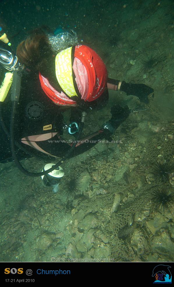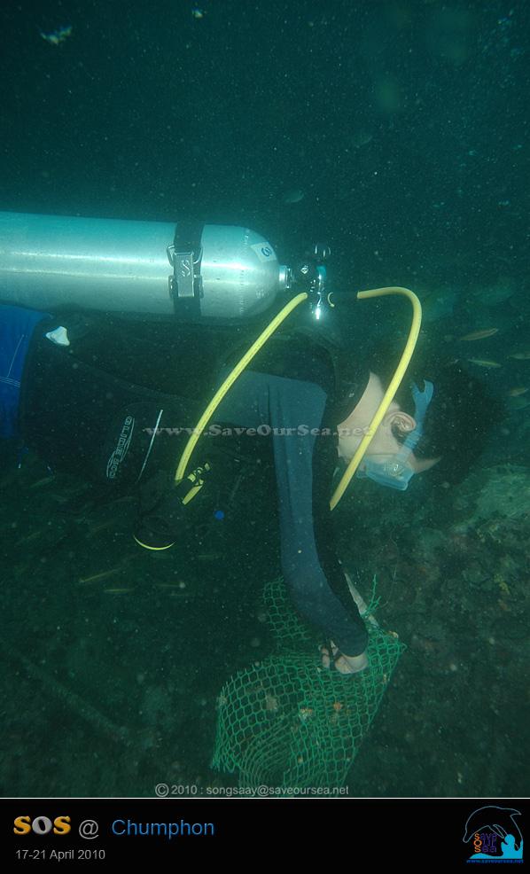 ที่ด้านเหนือของกองหิน....มีเศษอวนพันปะการังอยู่ไม่มากนัก เราจึงได้ภาพการทำงานของพวกเรามาอวดค่ะ.... ก้มหน้าตัด....ตัด...ตัด...