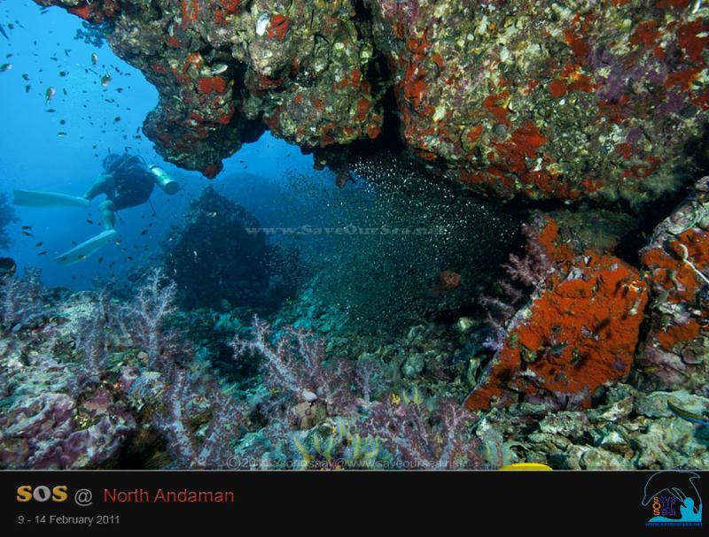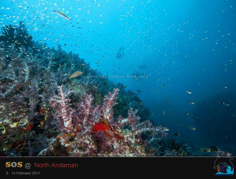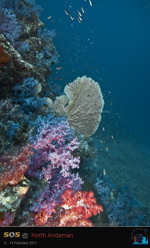 บริเวณเชิงผาที่ลาดชัน ปะการังอ่อนและกัลปังหาพัดยังขึ้นอยู่ทั่วไป...