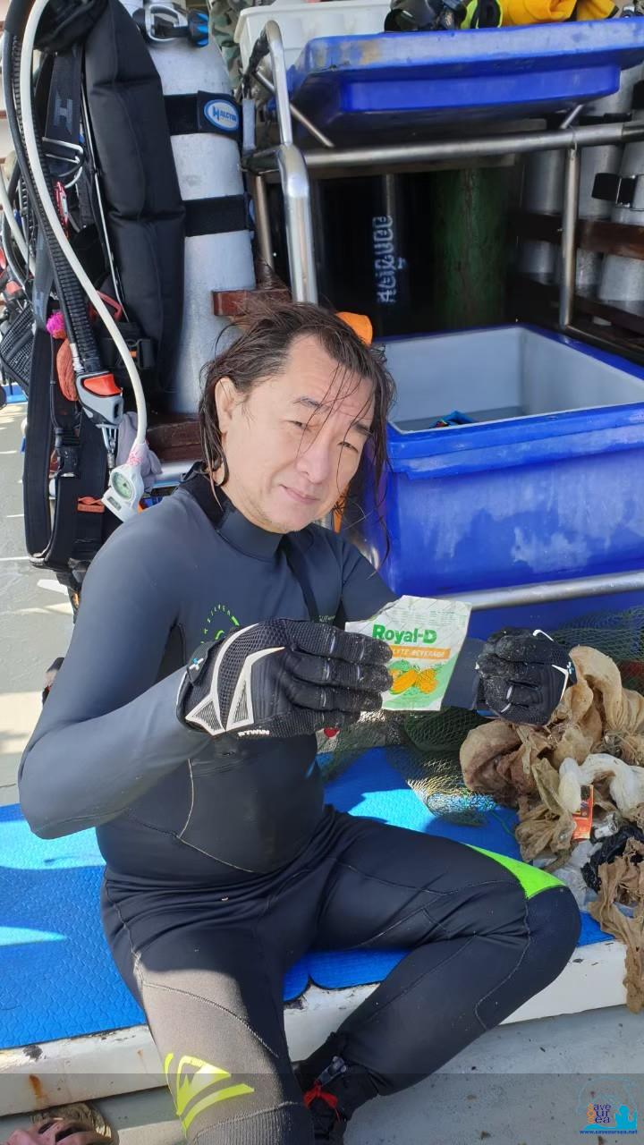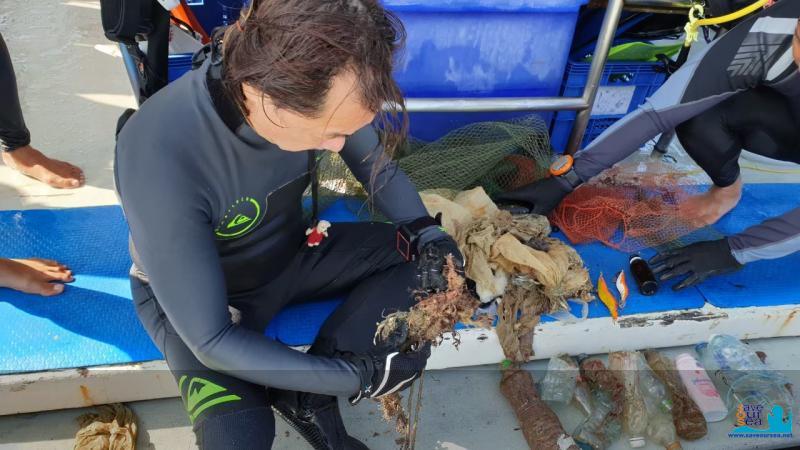 หลังจากเก็บขยะเศษอวนขึ้นมาทุกครั้ง เราจะช่วยกันแยกขยะแต่ละชนิด พวกกุ้งหอยปูปลา ที่ติดอวนมาเราก็ปล่อยกลับคืนลงทะเล