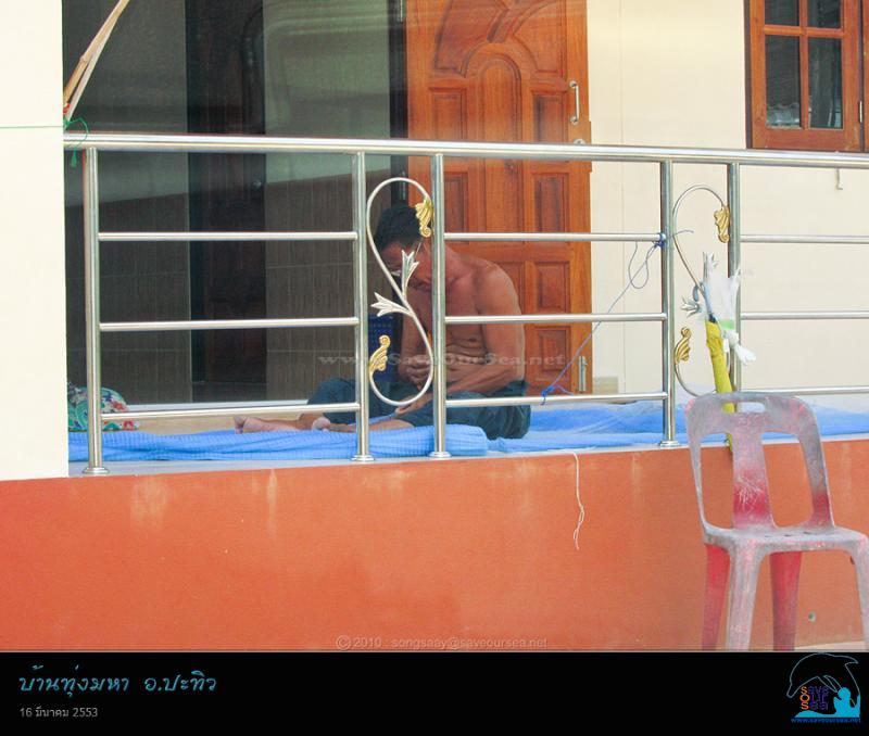 อย่างไรก็ตาม....เราได้พบกับชายสูงอายุท่านหนึ่ง ซึ่งกำลังนั่งเตรียมอวนตาถี่เล็กๆอยู่บนระเบียงบ้านที่สร้างเป็นตึกใหม่เอี่ยมอย่างดีและสวยงาม
