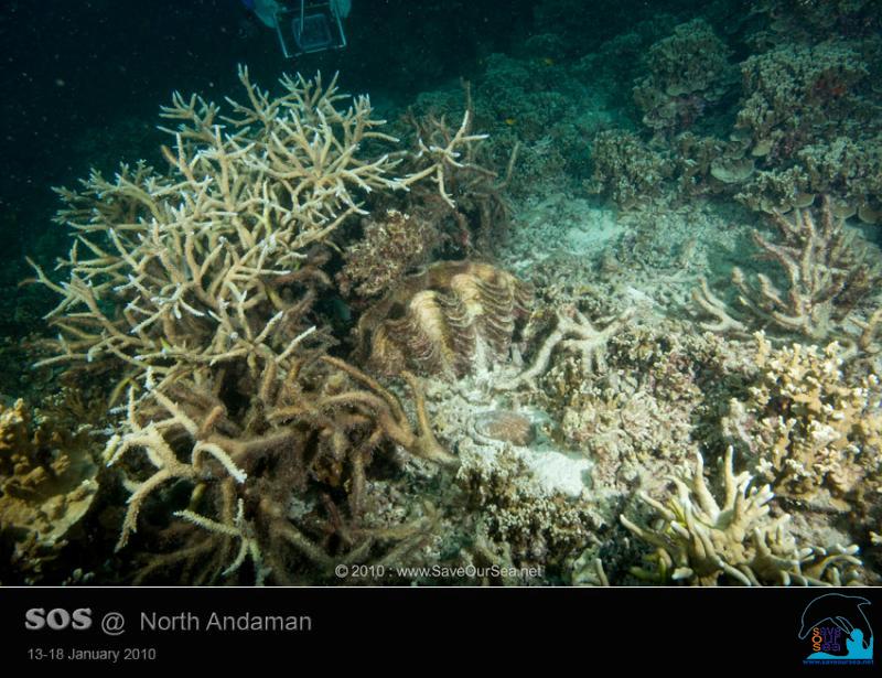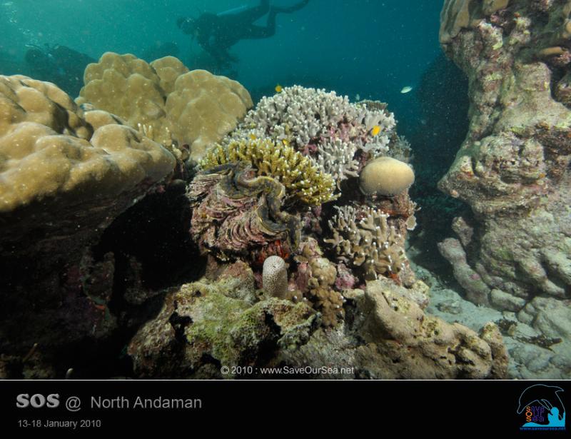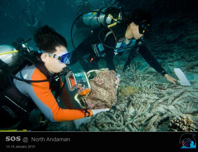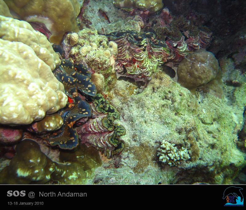 ภารกิจลำดับที่ 3 คือ การตรวจเช็คหอยมือเสือที่อ่าวช่องขาด อุทยานแห่งชาติหมู่เกาะสุรินทร์ ปล่อยไว้ตั้งแต่ปี 49 และกลับมาตรวจทุกปีๆละครั้ง .... ได้เห็นความเปลี่ยนแปลงทุกครั้ง โดยในครั้งสุดท้ายที่มา .... หาหอยมือเสือที่เราปล่อยไม่พบเลย ส่วนหอยดั้งเติมตัวใหญ่ๆที่อยู่ตามธรรมชาติเป็นสิบๆตัว ก็หนีไปเฝ้าพระอินทร์กันหลายตัวจนน่าตกใจ สภาพน้ำขุ่น ตะกอนลอยคลุ้งไปทั่วจนน่าเป็นห่วงว่าแดดจะลงมาไม่เพียงพอต่อการดำรงชีวิตของหอยมือเสือ น้ำ Surge โยนไปมาค่อนข้างแรง แนวปะการังมีสภาพเป็น Sandslide เลื่อนไหลลงไปยังร่องด้านล่าง มาปีนี้ สภาพน้ำดูดีขึ้น ไม่มี Surge ตะกอนน้อยลง แต่ .... เปลือกหอยที่ไร้เนื้อหอยเยอะมาก ทั้งตัวใหญ่และตัวเล็ก หมายเหตุ : หอยมือเสือที่กล่าวถึง และที่เราตั้งเป้ามาตรวจคือ หอยมือเสือพันธุ์ Tridacna Squamosa นะครับ ไม่ใช่ Tridacna Maxima หรือพวกหอยฝังหิน