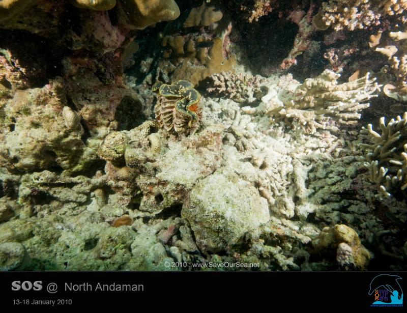ส่วนน้องหอยตัวนี้ ขนาดพอๆกับหอยที่เรานำมาปล่อย เธอถูกวางอยู่บนพื้นทรายเช่นกัน จึงต้องมีการย้ายที่เพื่อความปลอดภัยกันเล็กน้อย สังเกตจาก Skirts ที่บานและคมรอบเปลือกของเธอ จึงทำให้คิดว่า เป็นหอยธรรมชาติ ไม่ใช่หอยจากบ่อเพาะเลี้ยง ที่น่าแปลกใจกว่านั้นคือ เปลือกและ Skirts ของเธอค่อนข้างจะขาวสะอาดเหมือนเพิ่งผ่านการขัดขี้ไคลมาไม่นานนัก หอยมือเสือตัวนี้ เป็น Tridacna squamosa ขนาดเท่าๆกับกลุ่มที่เรานำมาปล่อยและเป็นเพียงตัวเดียวที่พบ ถ้าตัวนี้เป็นหอยตามธรรมชาติ ก็น่าจะพอสรุปได้ว่า หอยมือเสือที่เรานำมาปล่อยในปี 49 ได้ไปเฝ้าพระอินทร์ทั้งหมดแล้ว หรือ อาจจะมีบางส่วนหลบหนีไปเที่ยวสวนจตุจักรบ้างก็ได้
