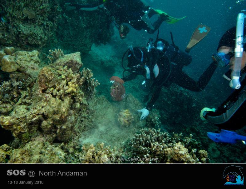 บริเวณที่เคยพบว่าเป็น Sandslide ลงไปเป็นหลุมลึกเมื่อปีก่อน มาครั้งนี้ บริเวณนั้น ได้กลายเป็นลานทรายโล่งๆไปแล้ว แต่พวกเราไปพบ น้องหอยตัวใหญ่ ยืนโดดเดี่ยวอยู่กลางลานทราย (มาได้ยังไงไม่ทราบ ปีที่แล้วไม่มี) ด้วยเกรงว่าน้องจะไหลเลื่อนลงร่องน้ำไปพร้อมกับทราย พวกเราจึงช่วยกันหอบหิ้ว ย้ายเธอมาจัดวางไว้กับแนวหินและแนวปะการังให้เธอได้มีความมั่นคงในชีวิตเพิ่มขึ้น