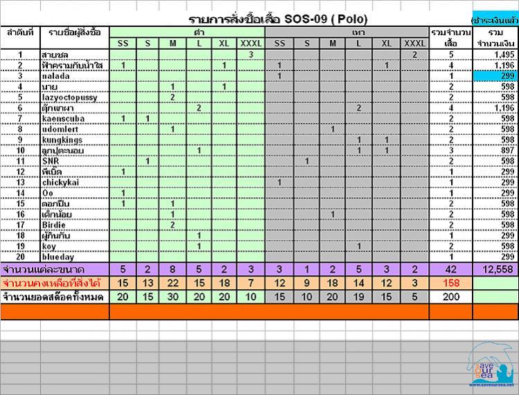 2) คุณ JCHEOWIT (ยังไม่ได้บันทึก รอยืนยันเรื่องสีโปโลอีกทีค่ะ) ------------------------------------------------------------------------เปิ้นสั่งด้วยคนนะคะ คอ v xL สีดำและขาวอย่างละตัวค่ะ โปโล xl 1 ตัว รวมสามตัวนะคะ Polo xl 1 สีอะไรค่ะ? รบกวนแจ้งกลับด้วยค่ะ 3) ส่งเบอร์บัญชีให้ blue day แล้วค่ะ 4) ตัดไซด์ XXL ออก และ แก้ไขจำนวนยอดสต๊อคใหม่ที่แน่นอน สรุปยอดถึงวันนี้ แก้ไขครั้งสุดท้ายโดย แมลงปอ : 16-12-2011 เมื่อ 08:09 |