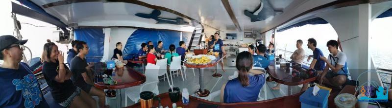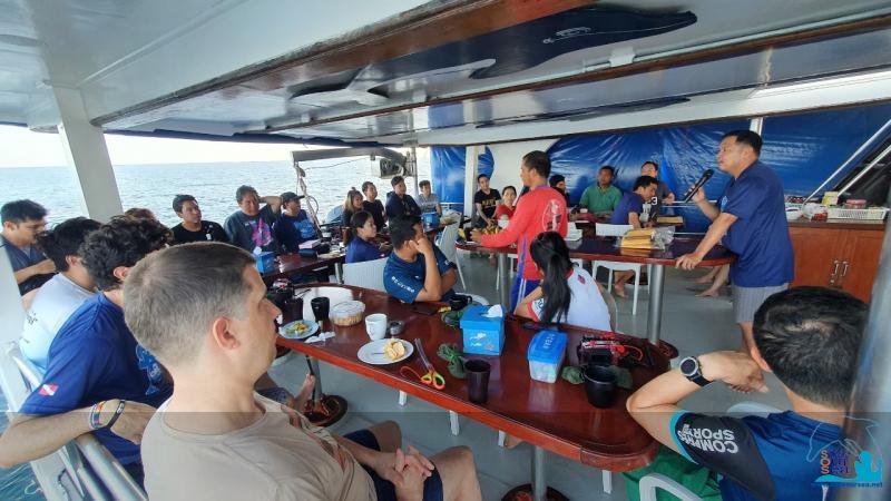 อาสาสมัคร sos บนชั้นสองของเรือ กำลังเตรียมอุปกรณ์ดำน้ำส่วนตัว ในขณะที่บางคนที่เตรียมอุปกรณ์เสร็จแล้ว ก็นั่งคุยสัพเพเหระตามประสาพี่ๆน้องๆบนชั้นสาม