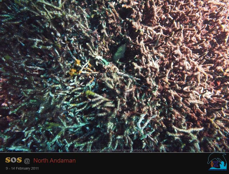 เลยจากปะการังโขดรูปเห็ดไปไม่ไกลนัก เคยเป็นแนวปะการังเขากวางที่ขึ้นแน่นเหมือนทุ่ง และเป็นที่อาศัยของปลาสวยงามในแนวปะการังมากมายหลายชนิด เมื่อมองอยู่ห่างๆ เรายังเห็นแนวปะการังเขากวางอยู่ แต่ผิดสังเกตตรงที่ปลาในแนวปะการังเล็กๆ เช่น ปลาสลิดหิน (Damselfish) ปลากะรังจิ๋ว (Basslets) ลดน้อยไปมาก และเมื่อเข้าไปใกล้ ก็ทำให้ตกใจ..... เพราะดงปะการังเขากวางทั้งหมด ได้แห้งตาย และมีสาหร่ายจับตามกิ่งปะการังเต็มไปหมดแล้ว เห็นแล้วอยากจะร้องไห้....