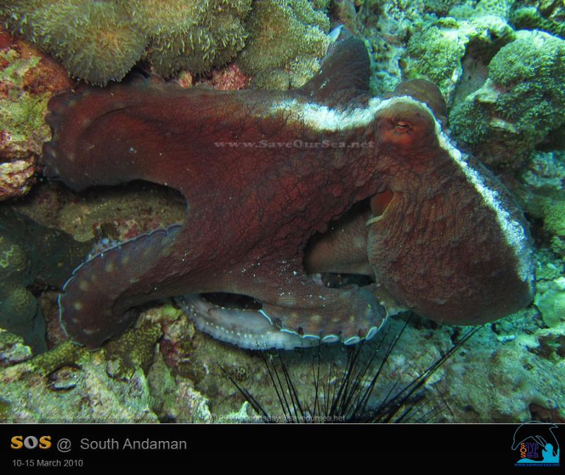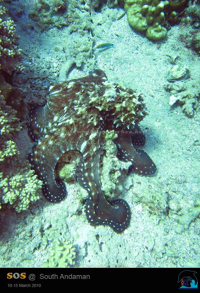 ระหว่างที่ขึ้นในอยู่ในแนวน้ำตื้นเพื่อพักน้ำ มีน้องๆชี้ให้ดูเจ้าหมึกยักษ์ตัวหนึ่งที่โผล่ลูกตาแพลมๆมาจากซอกหิน และเริ่มขยับออกมาให้เห็นทั้งตัว