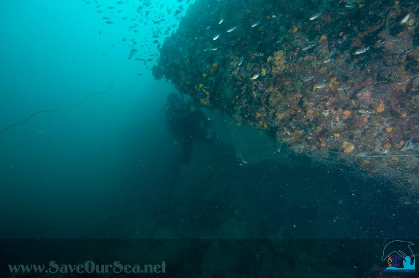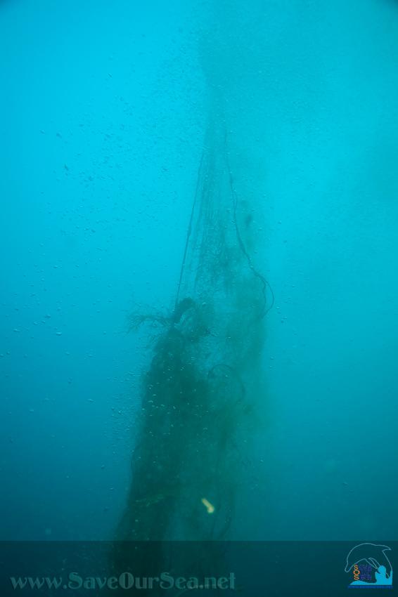 ไดฟ์นี้ พอสองสายว่ายเลยหัวมุมด้านใต้มาเพียงเล็กน้อย ก็พบเศษอวนที่เราเคยเก็บแต่ไม่หมด ยังคงติดหินเป็นพืดยาวสิบเมตรกว่า เหลียวซ้ายแลขวา ไม่เห็นมีคนอื่นนอกจากเรา 2 คน จึงต้องวางกล้องลง แล้วตัดๆๆๆๆ ....