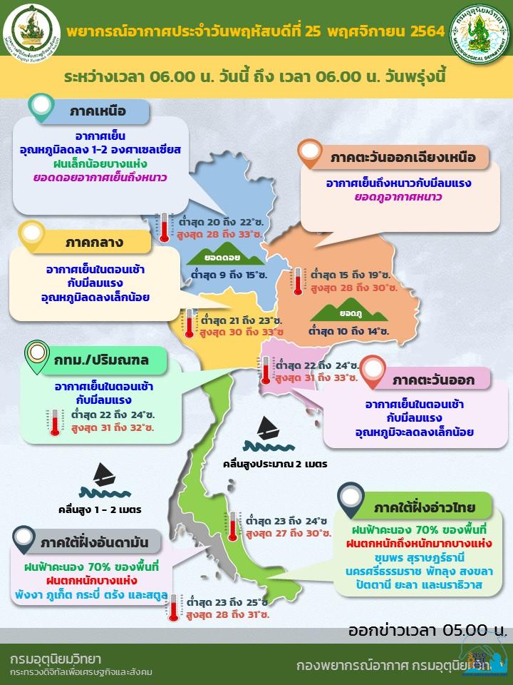 สภาวะอากาศทั่วไป พยากรณ์อากาศ 24 ชั่วโมงข้างหน้า บริเวณความกดอากาศสูงหรือมวลอากาศเย็นกำลังค่อนข้างแรงปกคลุมภาคตะวันออกเฉียงเหนือ ภาคตะวันออก และภาคกลางของประเทศไทยและทะเลจีนใต้ ทำให้ภาคตะวันออกเฉียงเหนือมีอากาศเย็นถึงหนาวกับมีลมแรง ส่วนภาคเหนือ ภาคกลาง และภาคตะวันออก มีอากาศเย็นกับมีลมแรง ขอให้ประชาชนบริเวณดังกล่าวดูแลรักษาสุขภาพเนื่องจากสภาพอากาศที่เปลี่ยนแปลงไว้ด้วย สำหรับมรสุมตะวันออกเฉียงเหนือที่พัดปกคลุมอ่าวไทยและภาคใต้มีกำลังค่อนข้างแรง ทำให้ภาคใต้มีฝนเพิ่มขึ้นกับมีฝนตกหนักถึงหนักมากบางพื้นที่ ส่วนคลื่นลมบริเวณอ่าวไทยจะมีกำลังแรงขึ้น โดยอ่าวไทยมีคลื่นสูงประมาณ 2 เมตร บริเวณที่มีฝนฟ้าคะนองคลื่นสูงมากกว่า 2 เมตร ขอให้ชาวเรือเดินเรือด้วยความระมัดระวัง กรุงเทพมหานครและปริมณฑล อากาศเย็นในตอนเช้า กับมีลมแรง อุณหภูมิต่ำสุด 22-24 องศาเซลเซียส อุณหภูมิสูงสุด 31-32 องศาเซลเซียส ลมตะวันออกเฉียงเหนือ ความเร็ว 10-25 กม./ชม. คาดหมาย ช่วงวันที่ 24 ? 27 พ.ย. 64 บริเวณความกดอากาศสูงหรือมวลอากาศเย็นกำลังค่อนข้างแรงจากประเทศจีนแผ่ปกคลุมประเทศไทยตอนบนและทะเลจีนใต้ ลักษณะเช่นนี้ทำให้บริเวณดังกล่าวยังคงมีอากาศเย็นและมีลมแรง สำหรับมรสุมตะวันออกเฉียงเหนือที่พัดปกคลุมอ่าวไทยและภาคใต้มีกำลังแรง ทำให้บริเวณภาคใต้มีฝนเพิ่มขึ้นกับมีฝนตกหนักบางแห่ง ส่วนคลื่นลมบริเวณอ่าวไทยมีกำลังปานกลาง โดยอ่าวไทยมีคลื่นสูงประมาณ 2 เมตร บริเวณที่มีฝนฟ้าคะนองคลื่นสูงมากกว่า 2 เมตร ส่วนบริเวณทะเลอันดามันคลื่นสูง 1-2 เมตร ส่วนในช่วงวันที่ 28 ? 30 พ.ย. 64 บริเวณความกดอากาศสูงหรือมวลอากาศเย็นกำลังค่อนข้างแรงอีกระลอกจากประเทศจีนจะแผ่เสริมลงปกคลุมประเทศไทยตอนบนและทะเลจีนใต้ ลักษณะเช่นนี้ทำให้บริเวณดังกล่าวอุณหภูมิจะลดลงอีก 2-4 องศาเซลเซียส กับมีอากาศเย็นถึงหนาวกับมีลมแรงอย่างต่อเนื่อง โดยมีฝนเล็กน้อยบางแห่งในภาคตะวันออกเฉียงเหนือ ภาคตะวันออก และภาคกลาง สำหรับมรสุมตะวันออกเฉียงเหนือที่พัดปกคลุมอ่าวไทยและภาคใต้ยังคงมีกำลังแรง ในขณะที่มีหย่อมความกดอากาศต่ำกำลังแรงบริเวณทะเลจีนใต้ตอนล่างจะเคลื่อนเข้าปกคลุมภาคใต้ ทำให้บริเวณภาคใต้มีฝนตกหนักถึงหนักมากบางแห่ง ส่วนคลื่นลมบริเวณอ่าวไทยมีกำลังแรงขึ้น โดยอ่าวไทยมีคลื่นสูง 2-3 เมตร บริเวณที่มีฝนฟ้าคะนองคลื่นสูงมากกว่า 3 เมตร ส่วนบริเวณทะเลอันดามันคลื่นสูงประมาณ 2 เมตร ข้อควรระวัง ในช่วงวันที่ 24-27 พ.ย. 64 ชาวเรือบริเวณอ่าวไทยควรเดินเรือด้วยความระมัดระวัง ส่วนในช่วงวันที่ 28-30 