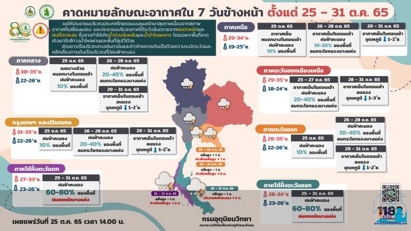 สภาวะอากาศทั่วไป พยากรณ์อากาศ 24 ชั่วโมง ประเทศไทยตอนบนมีฝนเพิ่มขึ้น โดยมีฝนฟ้าคะนองเกิดขึ้นได้ กับมีหมอกในตอนเช้า ส่วนภาคเหนือตอนบนและภาคตะวันออกเฉียงเหนือตอนบนยังคงมีอากาศเย็นในตอนเช้า ทั้งนี้เนื่องจากบริเวณความกดอากาศสูงหรือมวลอากาศเย็นจากประเทศจีนที่ปกคลุมประเทศไทยตอนบนและทะเลจีนใต้มีกำลังอ่อน ในขณะที่ลมตะวันออกที่พัดปกคลุมภาคเหนือ ภาคตะวันออกเฉียงเหนือตอนล่าง ภาคกลางตอนล่าง รวมทั้งกรุงเทพมหานครและปริมณฑล และภาคตะวันออกมีกำลังแรงขึ้น สำหรับร่องมรสุมกำลังอ่อนพาดผ่านภาคใต้ตอนกลาง ทำให้ภาคใต้ยังคงมีฝนฟ้าคะนองเกิดขึ้นได้ ขอให้ประชาชนบริเวณประเทศไทยตอนบนดูแลรักษาสุขภาพเนื่องจากสภาพอากาศที่เปลี่ยนแปลงในระยะนี้ไว้ด้วย กรุงเทพมหานครและปริมณฑล มีหมอกบางในตอนเช้า กับมีฝนฟ้าคะนองร้อยละ 40 ของพื้นที่ อุณหภูมิต่ำสุด 25-27 องศาเซลเซียส อุณหภูมิสูงสุด 32-34 องศาเซลเซียส ลมตะวันออก ความเร็ว 10-20 กม./ชม. คาดหมาย ในช่วงวันที่ 25 ? 27 ต.ค. 65 บริเวณความกดอากาศสูงหรือมวลอากาศเย็นกำลังอ่อนจากประเทศจีนปกคลุมประเทศไทยตอนบนและทะเลจีนใต้ ส่งผลให้มีลมตะวันออกและลมตะวันออกเฉียงใต้พัดปกคลุมภาคเหนือตอนล่าง ภาคตะวันออกเฉียงเหนือ ภาคกลาง รวมทั้งกรุงเทพมหานครและปริมณฑล และภาคตะวันออก ทำให้ประเทศไทยตอนบนมีฝนฟ้าคะนองเพิ่มขึ้นกับมีลมกระโชกแรงบางแห่ง ส่วนในช่วงวันที่ 28 ? 31 ต.ค. 65 บริเวณความกดอากาศสูงหรือมวลอากาศเย็นกำลังปานกลางอีกระลอกหนึ่งจากประเทศจีนจะแผ่ลงมาปกคลุมประเทศไทยตอนบนและทะเลจีนใต้ ลักษณะเช่นนี้ทำให้ประเทศไทยตอนบนมีฝนลดลง และอุณหภูมิจะลดลง กับมีลมแรง โดยอุณหภูมิจะเริ่มลดลงในภาคตะวันออกเฉียงเหนือก่อน ส่วนภาคเหนือ ภาคกลาง และภาคตะวันออก อุณหภูมิจะลดลงในระยะถัดไป สำหรับร่องมรสุมยังคงพาดผ่านบริเวณภาคใต้ตอนกลางและตอนล่างตลอดช่วง ทำให้ภาคใต้มีฝนตกต่อเนื่อง และมีฝนตกหนักบางแห่ง ส่วนคลื่นลมบริเวณทะเลอันดามันและอ่าวไทยมีกำลังอ่อน โดยทะเลอันดามันและอ่าวไทยมีคลื่นสูงประมาณ 1 เมตร บริเวณที่มีฝนฟ้าคะนองคลื่นสูง 1-2 เมตร ข้อควรระวัง ขอให้ประชาชนบริเวณประเทศไทยตอนบนดูแลรักษาสุขภาพเนื่องจากสภาพอากาศทีเปลี่ยนแปลง และประชาชนบริเวณภาคใต้ระวังอันตรายจากฝนตกหนักและฝนที่ตกสะสม ซึ่งอาจทำให้เกิดน้ำท่วมฉับพลันและน้ำป่าไหลหลาก โดยเฉพาะพื้นที่ลาดเชิงเขาใกล้ทางน้ำไหลผ่านและพื้นที่ลุ่มไว้ด้วย ส่วนชาวเรือบริเวณทะเลอันดามันและอ่าวไทยควรเดินเรือด้วยความระมัดระวังและหลีกเลี่ยงการเดินเรือบริเว