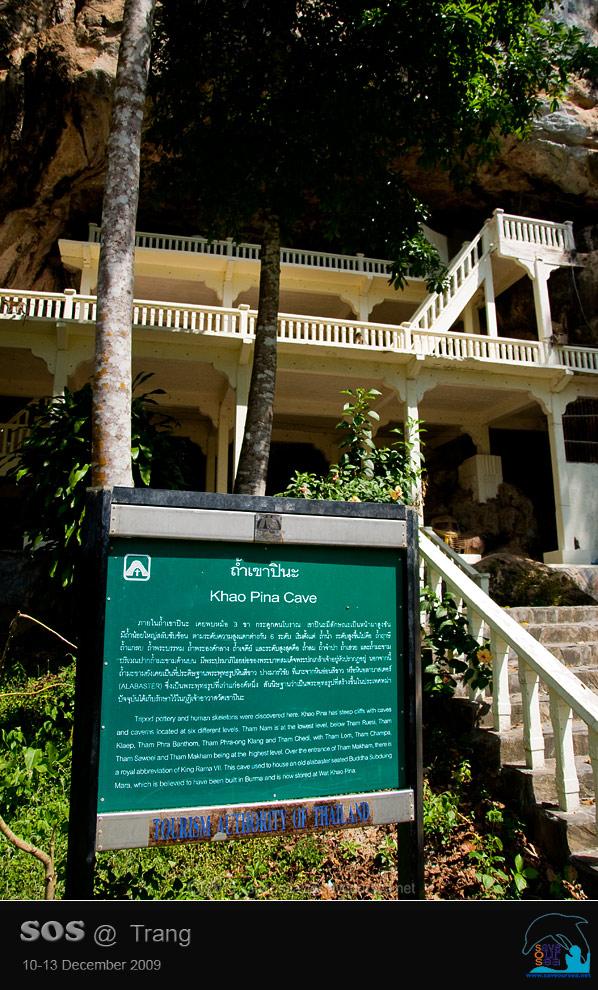 สถานที่ต่อไปคือ วัดถ้ำเขาปินะ .... ตั้งอยู่ ต.นาวง อ.ห้วยยอด จ.ตรัง ปินะเป็นภาษายาวี แปลว่า ผู้ชนะทุกสิ่ง บนป้ายหน้าทางขึ้นถ้ำ บอกเอาไว้ว่า .... "ภายในถ้ำเขาปินะ เคยพบหม้อ 3 ขา และกระดูกคนโบราณ เขาปินะมีลักษณะเป็นหน้าผาสูงชัน มีถ้ำน้อยใหญ่สลับซับซ้อน ตามระดับความสูงแตกต่างกัน 6 ระดับ เริ่มตั้งแต่ ถ้ำน้ำ ระดับสูงขึ้นไปคือ ถ้ำฤาษี ถ้ำแกลบ ถ้ำพระบรรทม ถ้ำพระองค์กลาง ถ้ำเจดีย์ และระดับสูงสุดคือ ถ้ำลม ถ้ำจำปา ถ้ำเสวย และถ้ำมะขาม บริเวณปากถ้ำมะขามด้านบน มีพระปรมาภิไธยย่อของพระบาทสมเด็จพระปกเกล้าเจ้าอยู่หัวปรากฎอยู่ นอกจากนี้ ถ้ำมะขามยังเคยเป็นที่ประดิษฐานพระพุทธรูปหินสีขาว ปางมารวิชัย ที่แกะจากหินอ่อนสีขาว หรือหินอลาบาสเตอร์ (Alabaster) ซึ่งเป็นพระพุทธรูปที่เก่าแก่องค์หนึ่ง สันนิษฐานว่าเป็นพระพุทธรูปที่สร้างขึ้นในประเทศพม่า ปัจจุบันได้เก็บรักษาไว้ในกุฏิเจ้าอาวาสวัดเขาปินะ"